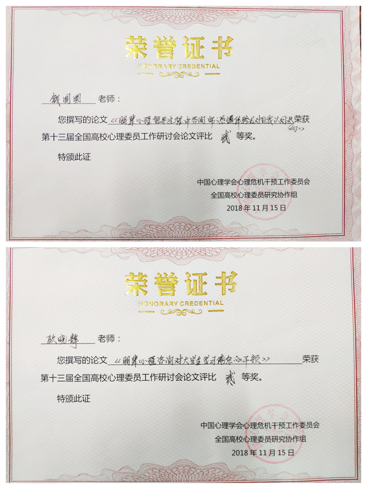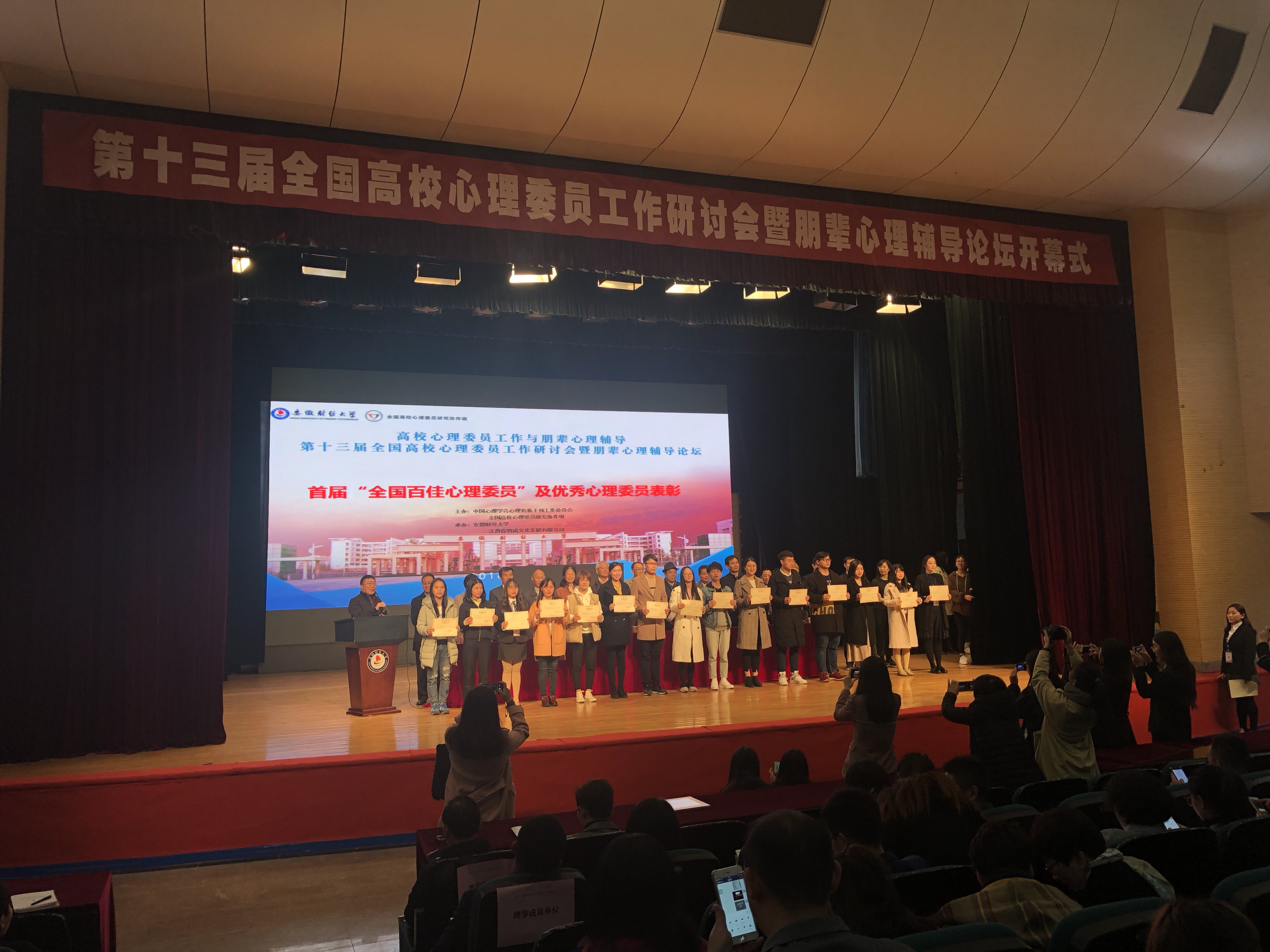 本次研讨会评选了优秀论文、全国百佳心理委员。学生处老师钱圆圆的《朋辈心理督导过程中咨询师的恐惧体验及对自我认同的影响》和电气学院辅导员欧晓静的《朋辈心理咨询对大学生学习倦怠的干预》两篇论文荣获二等奖;我校心理委员,机械学院周鹏飞、生化学院常婕妤和数理学院刘刚三名同学荣获 “全国百佳心理委员提名奖”。
