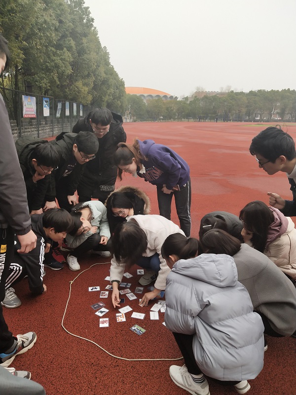 之后我们开始了“急速60秒”的游戏,老师说出游戏规则后,我们都一脸懵,“每队选一个人进入圈内把纸牌按1-30交给老师,其余人站在圈外不能碰牌也不能说话?”我们反复跟老师确认比赛规则,觉得游戏没有什么难度,“手速快就行,手速快就行!”我们得出一致结论。当游戏开始时,圈内的人翻开纸牌后,我们全傻眼了,原来纸牌上不是数字,而是各种各样的图案。前三轮下来,我们队伍处于劣势,我们没有受其他队欢呼雀跃的影响,而是静下来认真想着每一个图案应该代表的数字,有的具有多种可能,我们互相讨论,缩小范围,希望能够顺利完成游戏。最后一场时,我真的能感觉到60秒的重要性,直到最后一刻圈内的人还在递牌给老师。虽然我们没有挑战成功,但我们都觉得玩得很尽兴,队伍里的每一个人都不可或缺,我们是一个真正的队伍!