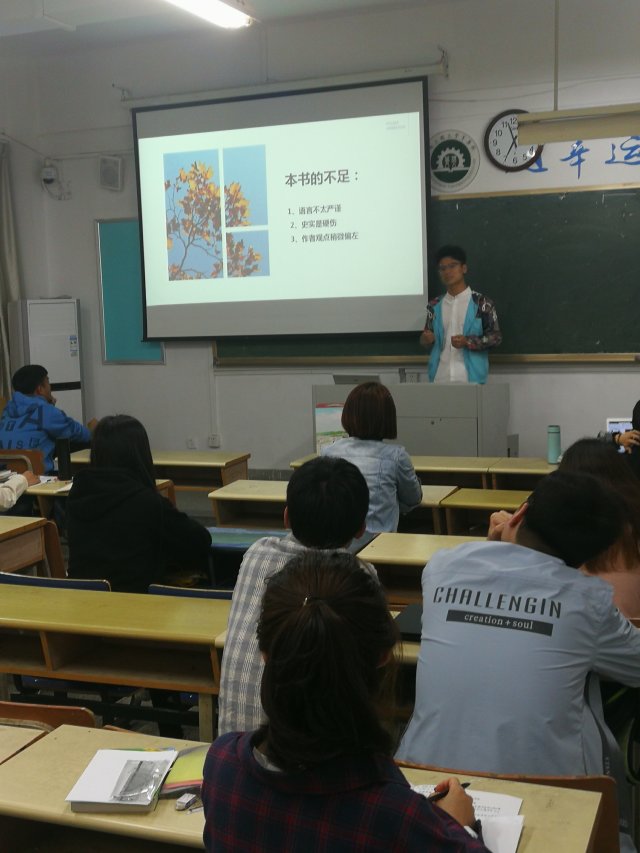 此次的读书分享会让我切实感受到了什么叫做你有一个想法,他有一个想法,互相分享便会产生三个想法。这次上台的10位同学的分享精彩纷呈,让自己看了许多,想了许多,学了许多。这次的让我们大家了解了关于少数民族的另一半且不一样的中国史,接着大家置境于京华烟云的民国故事,体会那动荡时期国家的围城境地与国民的面对围城进城出城的煎熬矛盾迷茫心境,暴露着人性的弱点。但无论怎样,每个人都是平凡的,书中的人物亦是,每个人都有着他们自己与夜莺为伴,追寻玫瑰的浪漫且平凡的故事,叙写着他们内心夹杂着劳动与爱情、挫折与追求、痛苦与欢乐的小小平凡的世界。一代大家汪曾祺也用其平淡质朴而又有弹性的语言描绘记叙着他的世界的日常生活等,给人以真与美的同时让我们重温古典主义的名士风的魅力。还有同学分享了《人口原理》这本书,让我们从文学转到了理论知识的一面,让我们了解了人口增长的模型及相关理论,也让我们对未来的世界及国家人口问题感到担忧与对其解决方案的一些猜想。总的来说,这次的读书分享贯穿了古今与中西,带给我们知识与哲理,也让自己从中感受到了一些由古至今的发展与中西文化的差异,但感觉最重要还是同学们的分享给予自身的感悟与启示,比如在日常学习生活中如何运用自控力调整自己的状态,如何使自己的压力产生积极效应,如何让卡耐基的成功学正确引导我们,如何洞悉人性的弱点去做到不要批评、责怪或抱怨等等,这些都是自己所欠缺和需要去学习运用的,大家的分享让我感悟并且学到了很多,自己收益匪浅。最后希望大家能够常伴书香,当一个追风筝的人,去追逐那只属于自己的光华鲜丽的“风筝”,纵使失败,为它,千千万万遍。