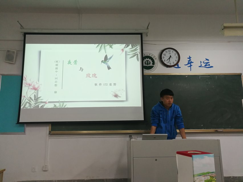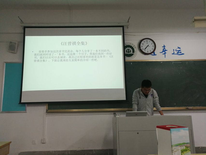 期待已久的读书分享会终于在周一晚上拉开序幕。通过这样的活动,不仅能更近距离从全新的角度认识班里的小伙伴,而且在短短的数小时里能够了解到多本书籍,拓宽视野。颇有意义。本次分享会共有十名同学中签展示。一千个读者就有一千个哈姆雷特,不同的读者对于不同的书有着卓然不同的了解。在《京华烟云》里,鲍同学用简洁幽默的语言带我们认识了命运多舛的三大家族。《平凡的世界》带我们认识了淳朴勤劳的陕北哥弟两的故事。还有《人性的弱点》,《另一半中国史》,《自控力》,《围城》,《追风筝的人》,《夜莺与玫瑰》,《汪曾祺文集》,《人口原理》。通过这次分享会,我也下定决心去看一看关于心理学方面的书籍,希望能锻炼自己的心意情绪。书籍是人类进步的阶梯,在不同年龄品鉴这句话着实有着不同的认识,也希望自己在烦躁的日子里多静下心来,细读自己喜欢的书籍,好好丰富自己的内心世界。