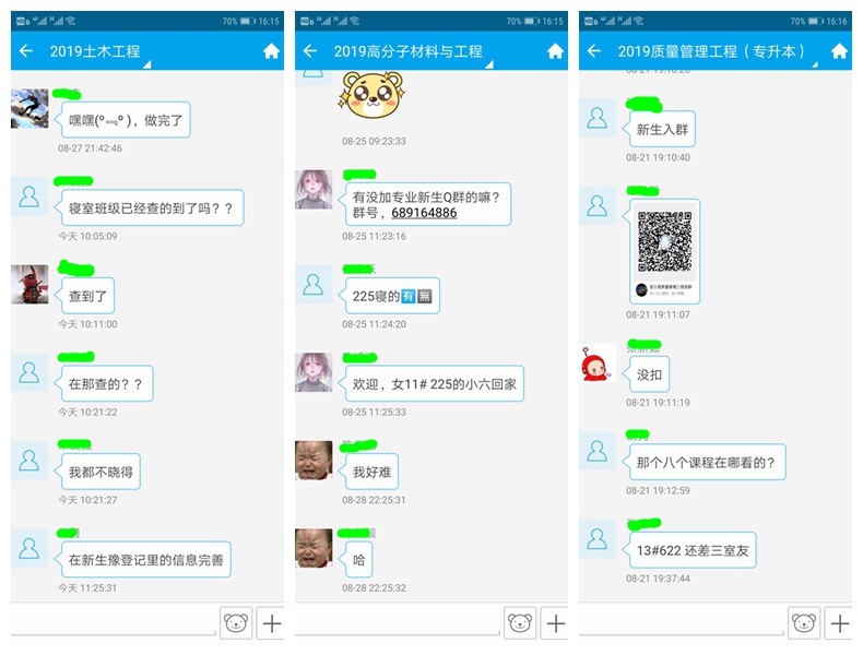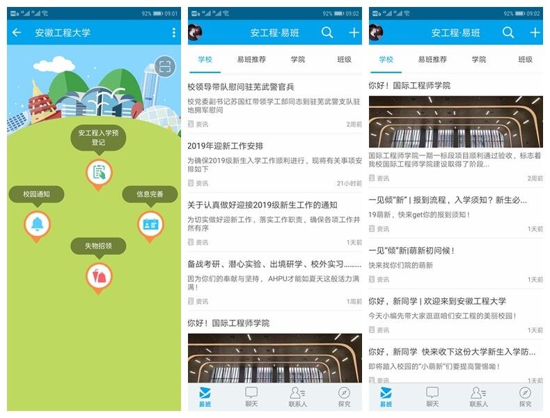 为了方便新生交流,易班打造了网上班级平台,易班网络班级的建立已成为新生提前了解学校和同学的重要平台。新生在班级内可以自由发言交流,对于新同学在班级里的疑问校易班工作人员和老师都会第一时间进行解答。在班级里同学们相互间也通过找舍友等活动,增进了彼此的了解和感情。通过在客户端首页转载宣传部、团委和招生办相关新闻宣传,帮助新生提前了解学校。
