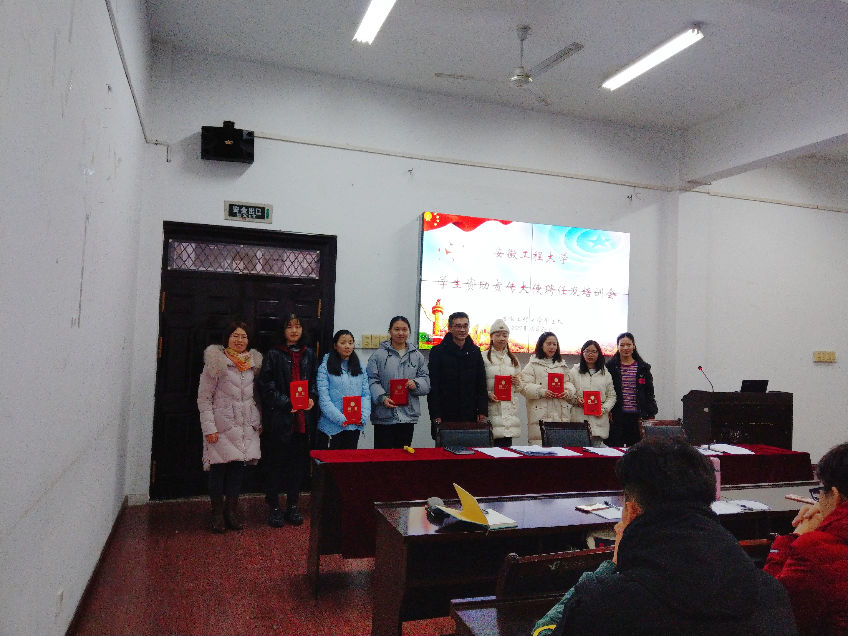 为落实学校“三全育人”综合改革实施方案的要求,深入推进资助育人工作,发挥获奖受助学生政策传播和励志引领作用,12月25日,学校在师生活动中心一楼招聘大厅召开2019年“学生资助宣传大使”聘任暨培训会,聘任2019年获得国家奖学金的34名学生为 “学生资助宣传大使”。学生处副处长黄炜、学生资助管理科张玉凤、辅导员资助育人工作室主任万海洮和获得国家奖学金全体学生参加。会议由张玉凤主持。