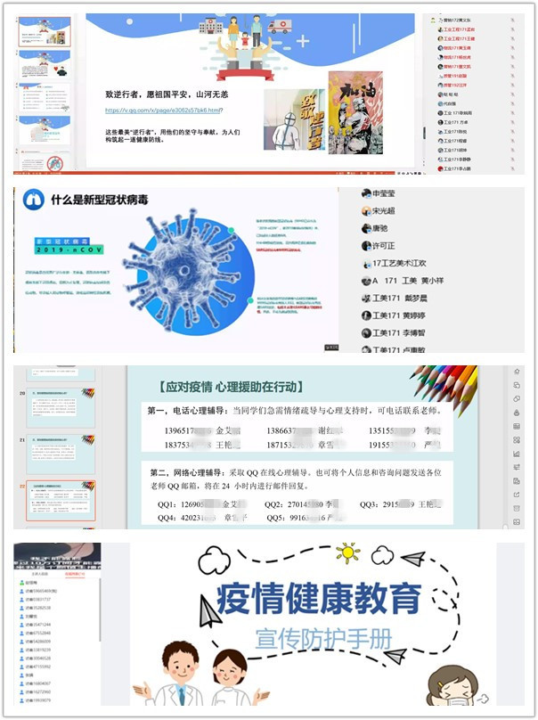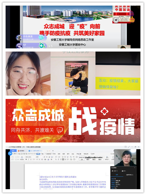 为切实做好疫情防控期间学生思想教育、心理辅导、资助帮扶和就业创业指导等工作,全体辅导员聚焦思想引领、强化责任担当、牢记育人使命,创新形式,采用易班、QQ群等多种互联网工具开展了网络主题班会等大量扎实有效的工作。