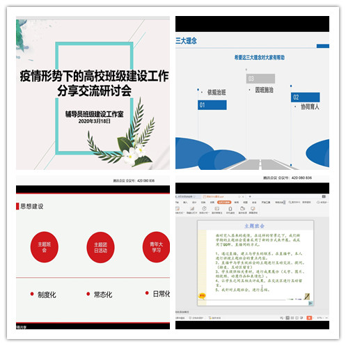 立足围绕学生,着力因事而化。学生在哪里,思想政治工作就做到哪里。思想教育工作室积极开展“思想抗疫”系列活动,紧紧围绕思想引领,强信心,聚人心,以“思想抗疫”促“行动抗疫”,全面融合新时代爱国主义教育,不断强化防疫抗疫期间的学生思想教育管理的时效性。 网络思政工作室成员依托“网格化”工作体系,以班委群、班级群、专业群为单位,利用“易班”、“腾讯会议”、“QQ课堂”等网络平台与同学们共同观看了“全国大学生同上一堂疫情防控思政大课”,并展开线上学习研讨活动,共同感受战“疫”力量。就业创业工作室努力当好“就业红娘”,确保我校就业服务在疫情防控关键期不断线,将开展就业指导网络咨询服务月活动,打造就业氛围营造、毕业生求职技巧等系列精品主题班会,为我校毕业生就业工作保驾护航。资助育人工作室细研精准帮扶,着力资助育人,让资助工作贴近学生、走进学生,让资助育人的理念和方法进校园、进宿舍、进书本、进课堂、进头脑,培养学生的感恩意识和奉献精神,了解学生动态,鼓励学生努力学习,助力学生成长成才。