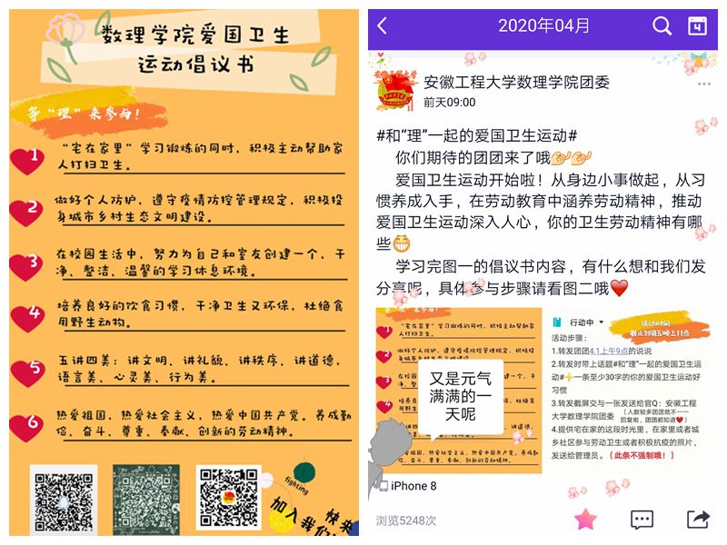 四月是爱国卫生月。为进一步深入学习领会习近平总书记重要讲话精神,把爱国卫生运动作为打赢疫情防控人民战争重要手段,号召大学生主动从身边事做起,从习惯养成入手,在劳动教育中涵养劳动精神,4月1日至3日,数理学院团委利用新媒体平台,举办以“和‘理’一起的爱国卫生运动”的网络主题活动。