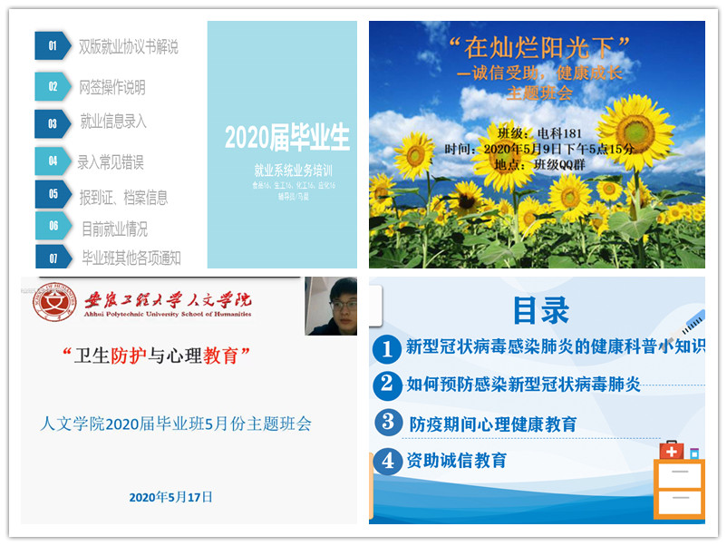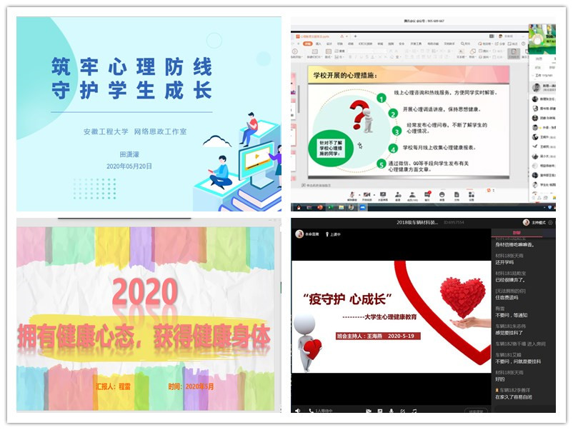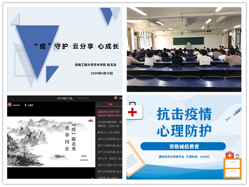 为认真贯彻落实习近平总书记关于新冠肺炎疫情防控的重要讲话和指示批示精神,严格执行省委省政府、省委教育工委省教育厅部署安排和芜湖市委市政府联防联控要求,确保2020年春季学期学校工作平稳运行,加强对学生卫生防护技能知识培训和心理健康教育,多措并举保证学生身心健康和安全,全体辅导员采用易班、QQ群等多种网络工具,线上线下联动开展学生思想政治教育工作。