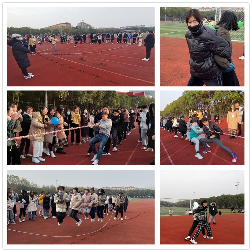下午2点,第二田径场人声鼎沸,人文学子正在这里开展“趣味拔河”、“跳大绳”、“面粉传递”、“盲人方阵”和“爱的爆抱”等五项趣味活动。各支参赛队伍秉持“友谊第一,比赛第二”的原则,在团结友爱、积极向上的氛围中,同学们积极参与每一项活动。在拔河比赛中,每支队伍精神抖擞,待裁判员一声令下,双方紧紧握绳,全力以赴,用尽全力追逐胜利。经过长达两个小时的比拼,最终行管202、社工(升)202、行管191三支队夺得一等奖;“社工(升)201、行管(升)201、行管192三支队伍获得二等奖;行管201、法学201、法学202、行管(升)202四支队伍获得三等奖。