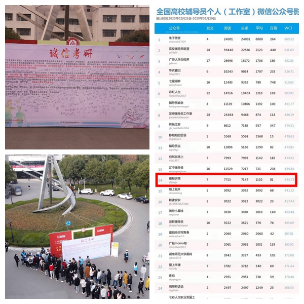 自创立公众号以来,以习近平新时代中国特色社会主义思想为指导,把握我校青年大学生思想和实际需求的脉搏,结合学校大学生思政工作特色,坚持做原创,做品牌,做服务。陆续推出“厉害了我的学长学姐”“考研复试指导”“报考指导”“历年考研数据分析”等系列品牌专题。目前已在该平台累计推送网络思政文章325篇,其中原创文章196篇,达30万余字。微信公众号“徽程研路”多次进入全国高校辅导员微信公众号排行榜前30。公众号内容生产致力讲述安工程学子的考研故事,传递同学们关心的升学就业咨询,增强榜样的力量,积极营造学习典型、宣传典型良好氛围,不断服务学生成长。