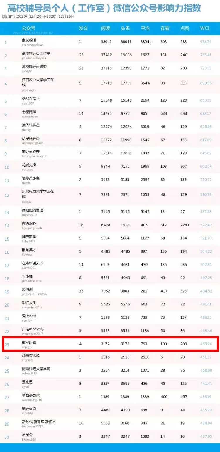 近日,“辅导员参谋”发布了全国高校辅导员微信公众号影响力排行榜(12月20日-12月26日),我校网络思政辅导员工作室老师和同学运营的微信公众号“徽程研路”进入全国高校辅导员微信公众号排行榜前30,位于第23位。