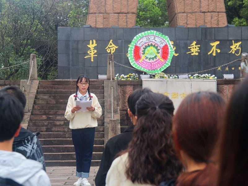 烈士碑下,全体同学在烈士陵园悼念广场上整齐列队向牺牲烈士默哀三分钟,默哀结束后,校易班工作站学生代表丁子心,为在场的每一位同学介绍烈士们的故事,极具感染力的声音让所有人都感受到了先驱们的永垂不朽,浩然正气。随后,全体成员怀着崇高的敬意,深深三鞠躬,接着,两位代表走上烈士碑前,献上悼念的花束。
