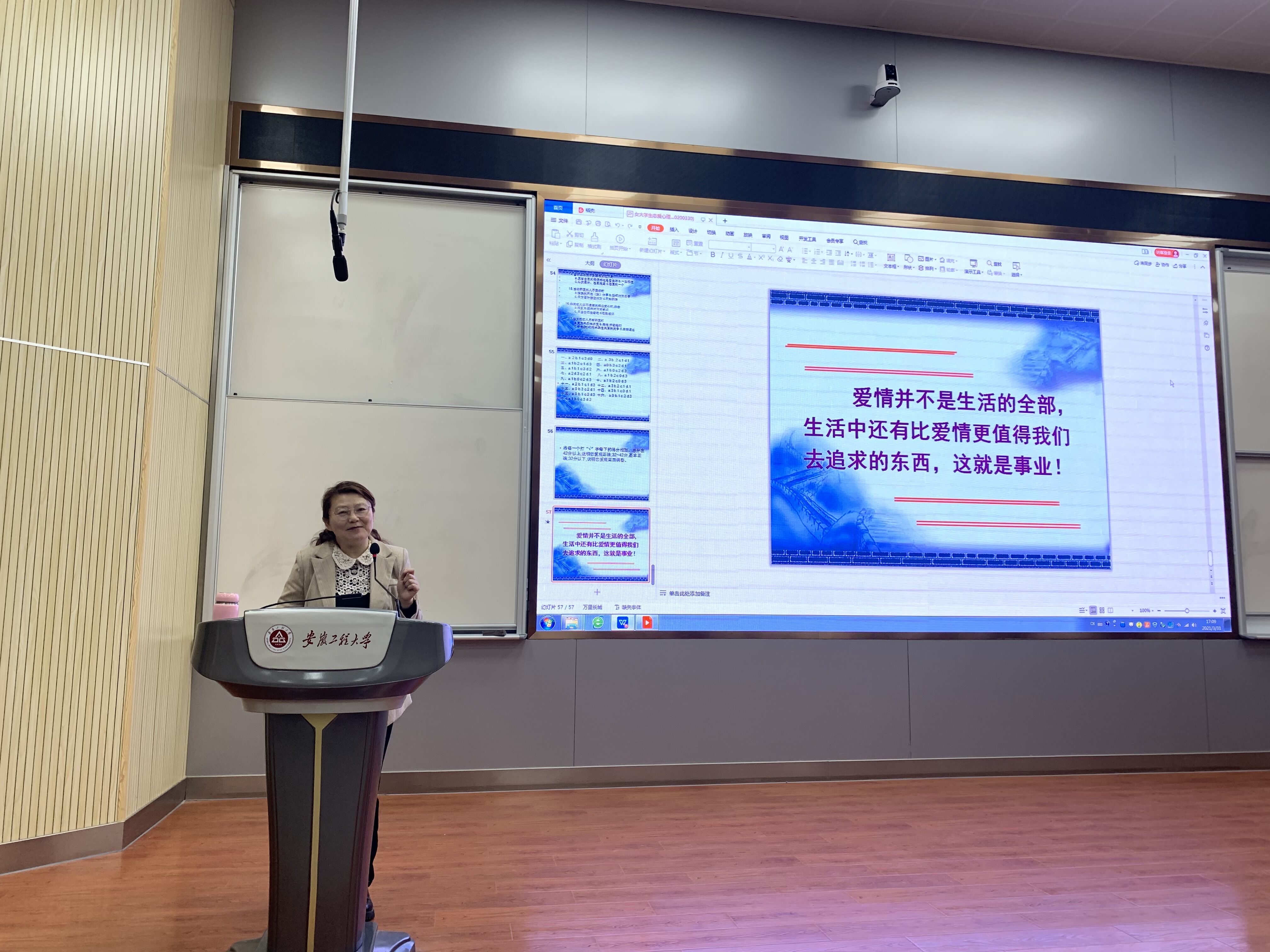 为进一步引导我校女大学生积极关注自身心理健康,树立正确的恋爱观与价值观,增强自我保护与爱的能力,促进心理成长,提升关爱自我和关爱他人的感悟力、自控力和行动力,2021年3月31日下午,校心理健康教育与咨询中心和心理育人工作室联合举办主题为《女大学生恋爱心理及调适》心理健康知识讲座。讲座邀请到了人文学院党委副书记、安徽省社会心理学会副会长金艾裙教授作为主讲人,校心理中心工作人员、心理育人工作室老师以及来自全校15个学院近300名女大学生代表参加了此次讲座。