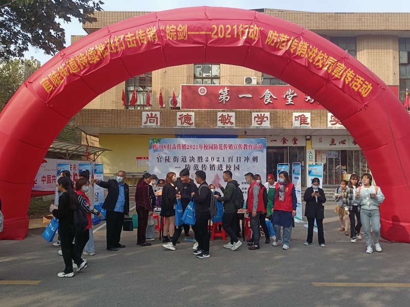为进一步加大打击传销工作力度,让学校师生了解传销、打击传销、远离传销,积极构建和谐平安校园,10月25日,官陡街道办事处组织新时代文明实践站的志愿者连同官陡街道网格化管理中心来校开展打击传销“皖剑——2021行动”防范传销进校园宣传活动。