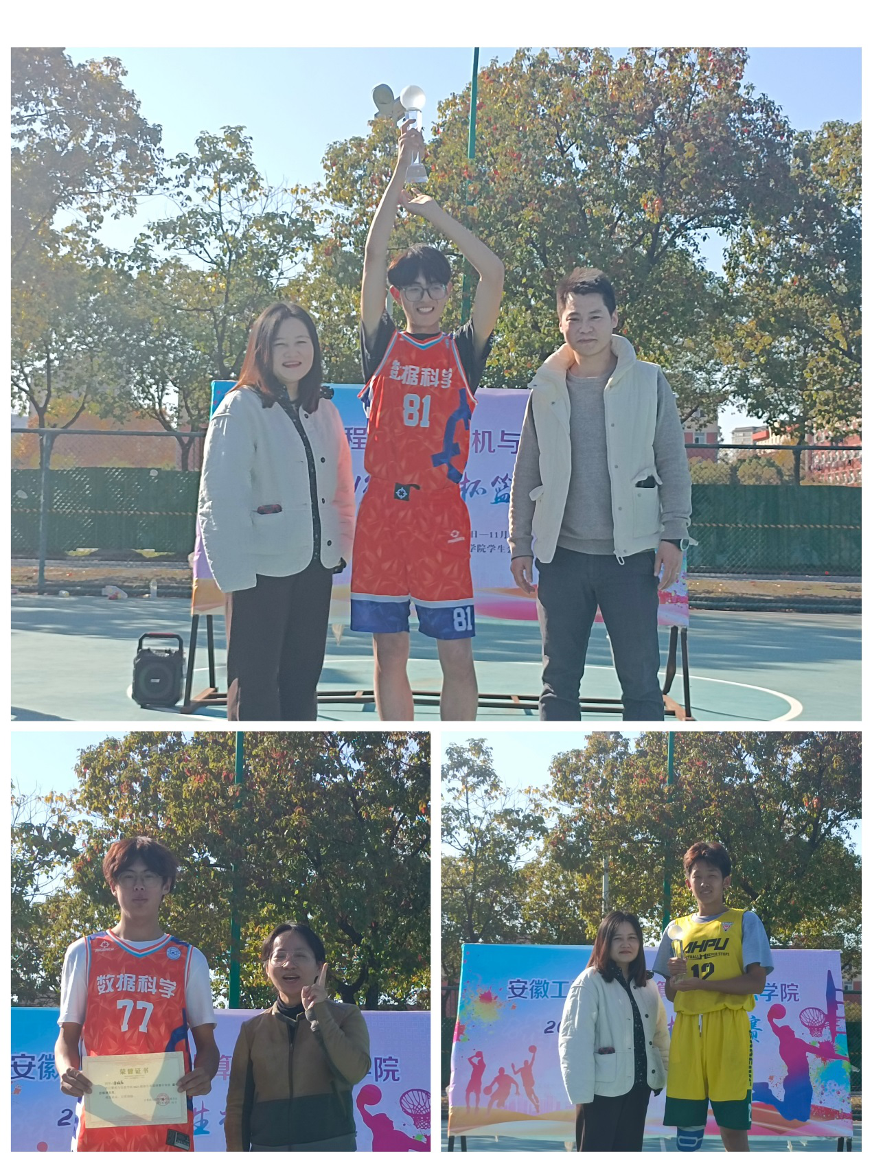 经过决赛的激烈比拼后,数据科学专业获得冠军,计算机专业获得亚军,物联网专业获得了季军,软件工程专业获得了最佳组织奖,其中数据科学21级新生徐铭辰获得了最有价值球员称号。院团委副书记和新生辅导员王鸣鹃、郭煜锋为获奖队伍和球员颁奖并合影留念。