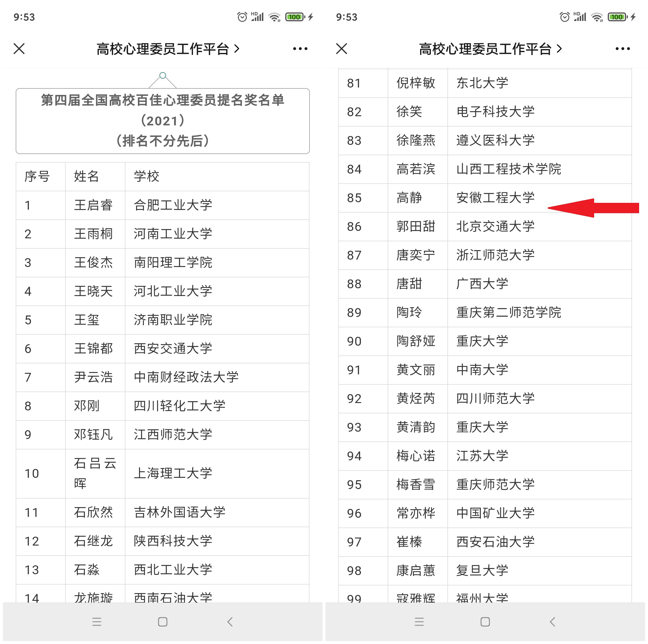 经过会议评选,我校艺术学院2019级代楠楠同学获得第四届“全国百佳心理委员”荣誉称号,并成功入选成功竞选论坛主席团,担任副主席职务;生物与食品工程学院学院2020级高静获得第四届“全国百佳心理委员提名奖”荣誉称号。