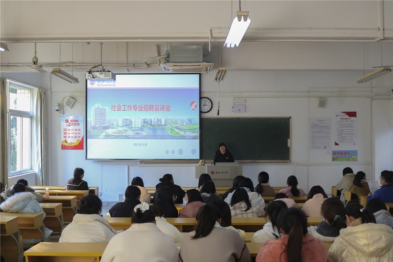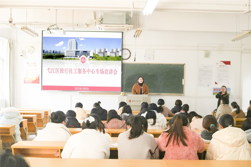 第三场招聘会,芜湖益群社会工作服务中心负责人储晓云通过精心制作的演示文稿向各位毕业生明确展示了薪资待遇等相关资讯。芜湖市益群社会工作服务中心于2016年在芜湖市民政局注册成立的3A级民办非营利社工机构,以“助人自助-陪伴·成长”的理念为有需要的人提升能力、改善其生活环境,最终促进其个人更好成长和发展。宣讲结束后,益群社工先生和同学们进行了热情互动,为同学们答疑解惑。会后,有意向的同学们纷纷提交简历并参加面试。