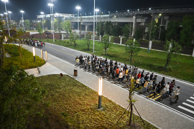 每晚9点10分,活动正式开始。晚风里夹杂着些许的凉意,但同学们热情高涨,环校跑步路线上的十三张航天展板指引大家前进的方向。在领跑员的带领下,大家沿着校园夜跑路线奔跑,没有排名之分、无速度之争,任汗水浸透衣衫。参跑者齐整的动作,构成了黑夜里一道健康向上的靓丽风景。学院团委学生会为大家准备了精美宇航员纪念品挂件,希望同学们都能像宇航员一样坚定理想、不畏困难、砥砺前行。电气203邓宇杰很喜欢这样的活动。他说,能和同学朋友一起夜跑,既能感受到运动的快乐,又能获得满满的集体荣誉感。