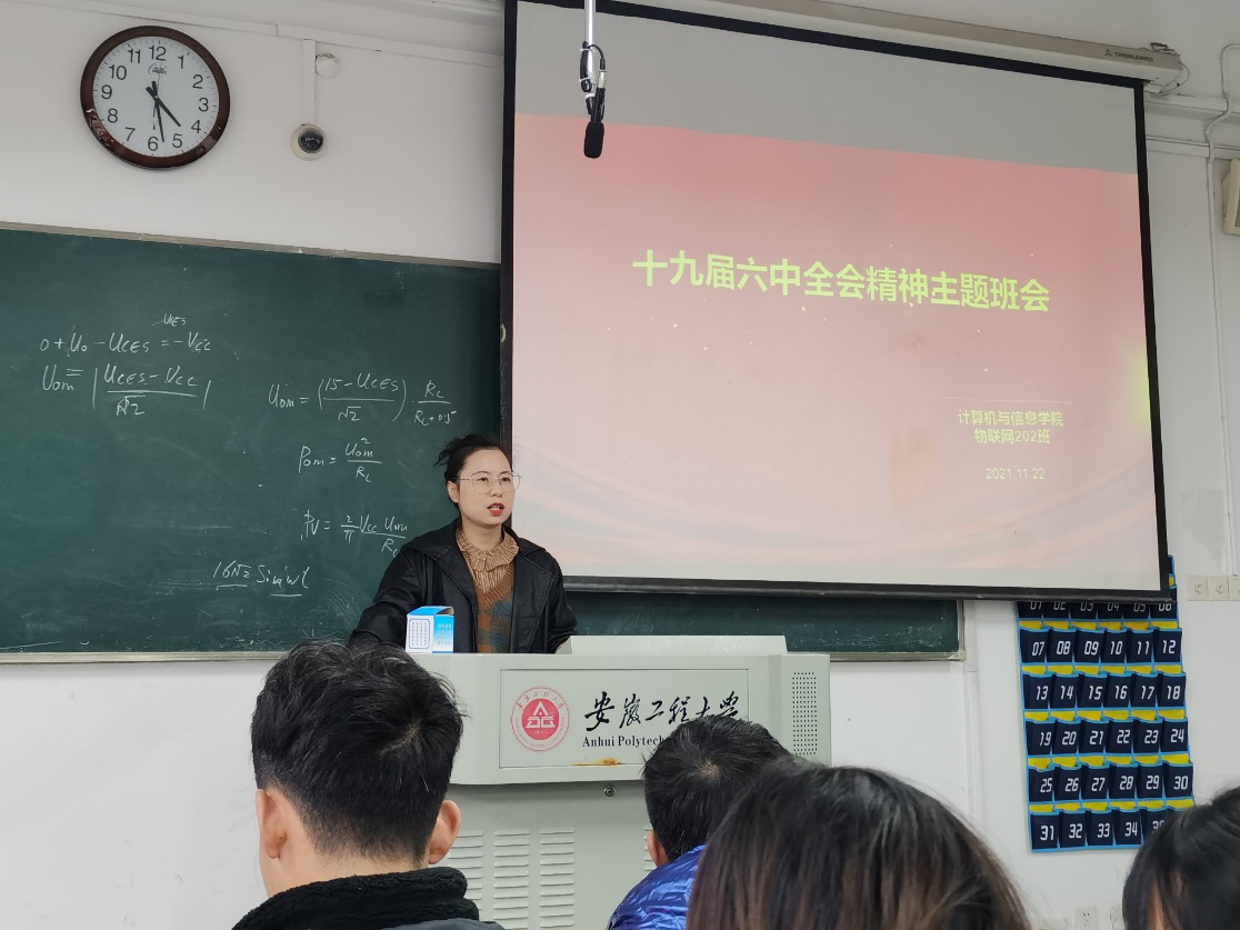 12月21日上午,2020级物联网工程专业全体学生在5J404开展学习贯彻党的十九届六中全会精神主题团日活动。辅导员魏晓飞为同学们解读了党的十九届六中全会重要讲话精神,并希望同学们爱党爱国,好学上进,用信仰信念引领青春方向,用拼搏奉献彰显青春力量。