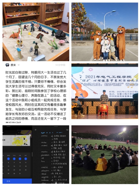 围绕“一院一主题”,各二级学院结合专业特点,制定主题鲜明的心理健康宣传教育活动。材料科学与工程学院“回忆有‘料’,心‘材’成长”温暖日记撰写活动和数理学院“发现身边的闪光点”线上征集大赛,鼓励学生记录生活,感受美好。机械工程(人工智能)学院和经济与管理学院分别举办“心成长,梦铸就”短视频大赛、心理情景剧原创剧本大赛,为学生们提供表达自我的空间。电气工程学院以专场音乐会的表现手法来滋养和疗愈学生心灵。艺术学院借助心理漫画绘心绘意,筑梦成长。生物与食品工程学院与化学与环境工程学院延续品牌,助力考研传递温暖。此外,计算机与信息学院的21天习惯养成活动、人文学院的“青春启航,永不迷茫”主题班会、建筑工程学院的“百年奋斗,初心弥坚”英雄事迹分享活动、纺织服装学院、外国语学院和体育学院特色趣味运动会等进一步扩大了活动的覆盖面,提高了学生的参与度,营造了全校齐参与,共筑心健康的良好氛围。