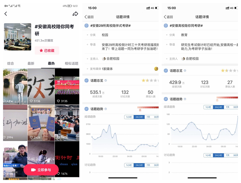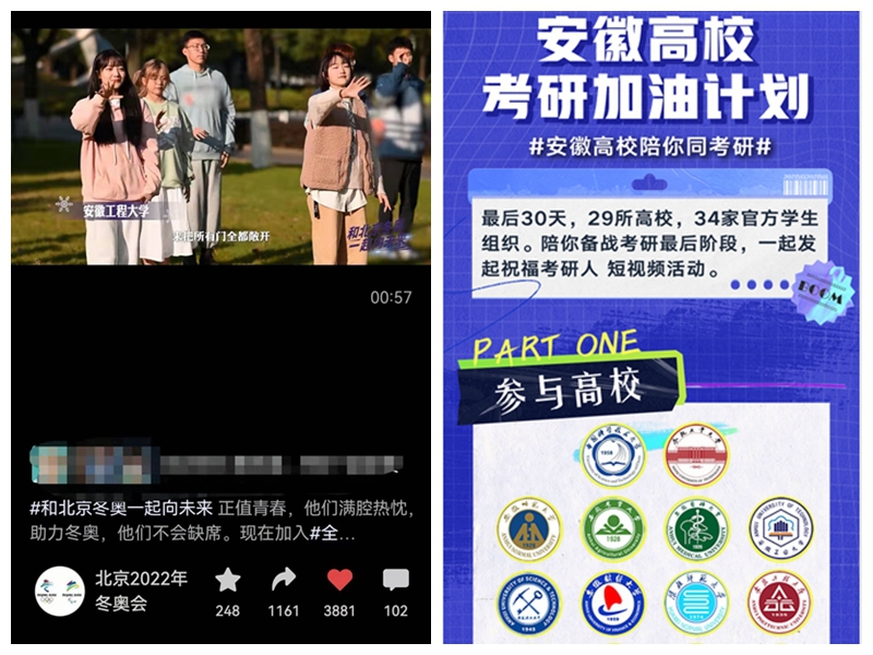 2021年9月学工部视频号联合“央视新闻”开展话题为“打开录取通知书”开学季活动;11月受北京冬奥组委会邀请开展北京冬奥会、冬残奥会主题口号“一起向未来”宣传推广活动,拍摄的手势舞作品成功在冬奥会官方账号展播;12月在“安徽省网络思政中心”和“中国大学生在线”指导下,联合安徽省29所高校(包含驻皖的中国科学技术大学和合肥工业大学)一起开展“倒计时30天安徽高校陪你同考研”短视频活动,最终话题共发布164次,全网阅读量突破1450万次。
