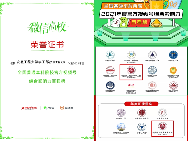 今日,教育部中国大学生在线网站联合腾讯公布“全国普通本科院校2021年度官方视频号综合影响力百强榜”,我校学工部视频号入榜,并与清华大学、中国政法大学、浙江大学等五所高校一起获得“年度正能量”单项奖。