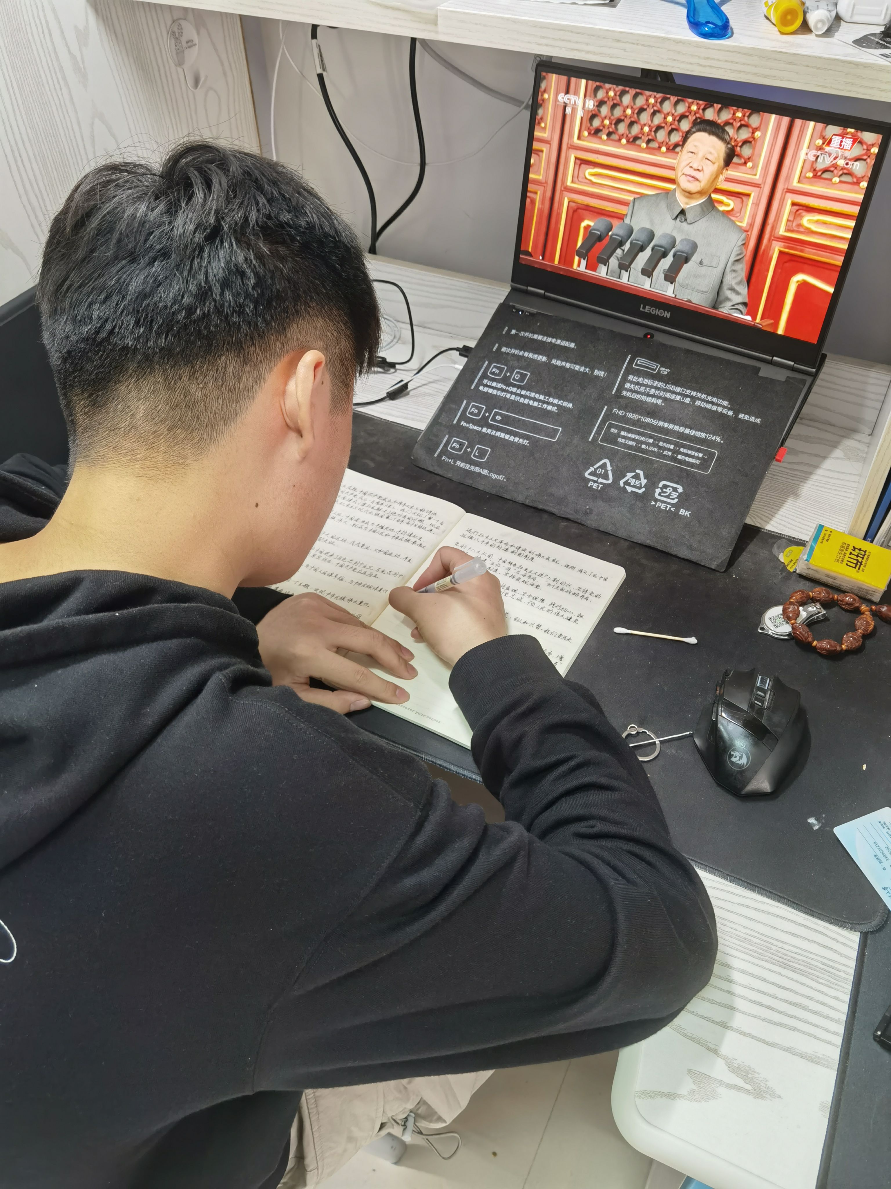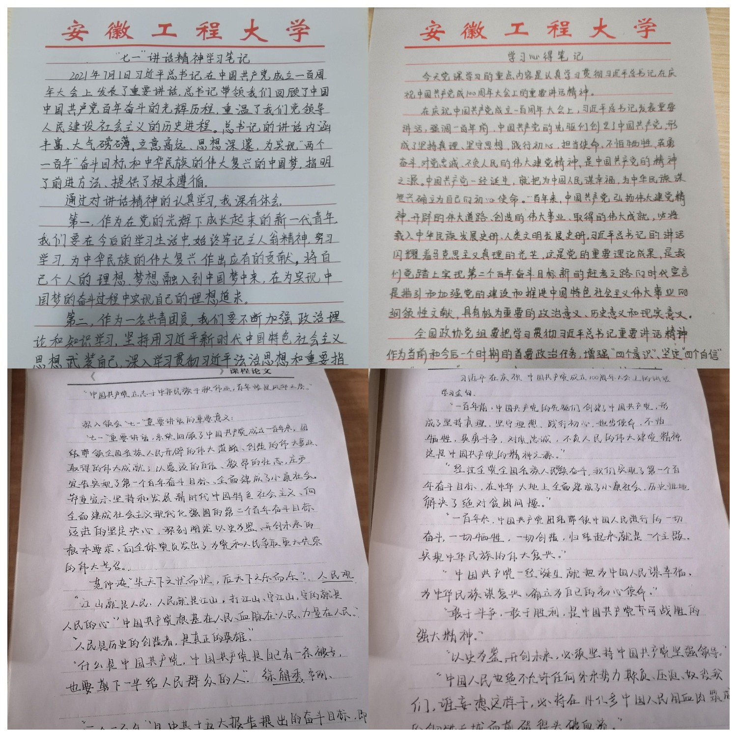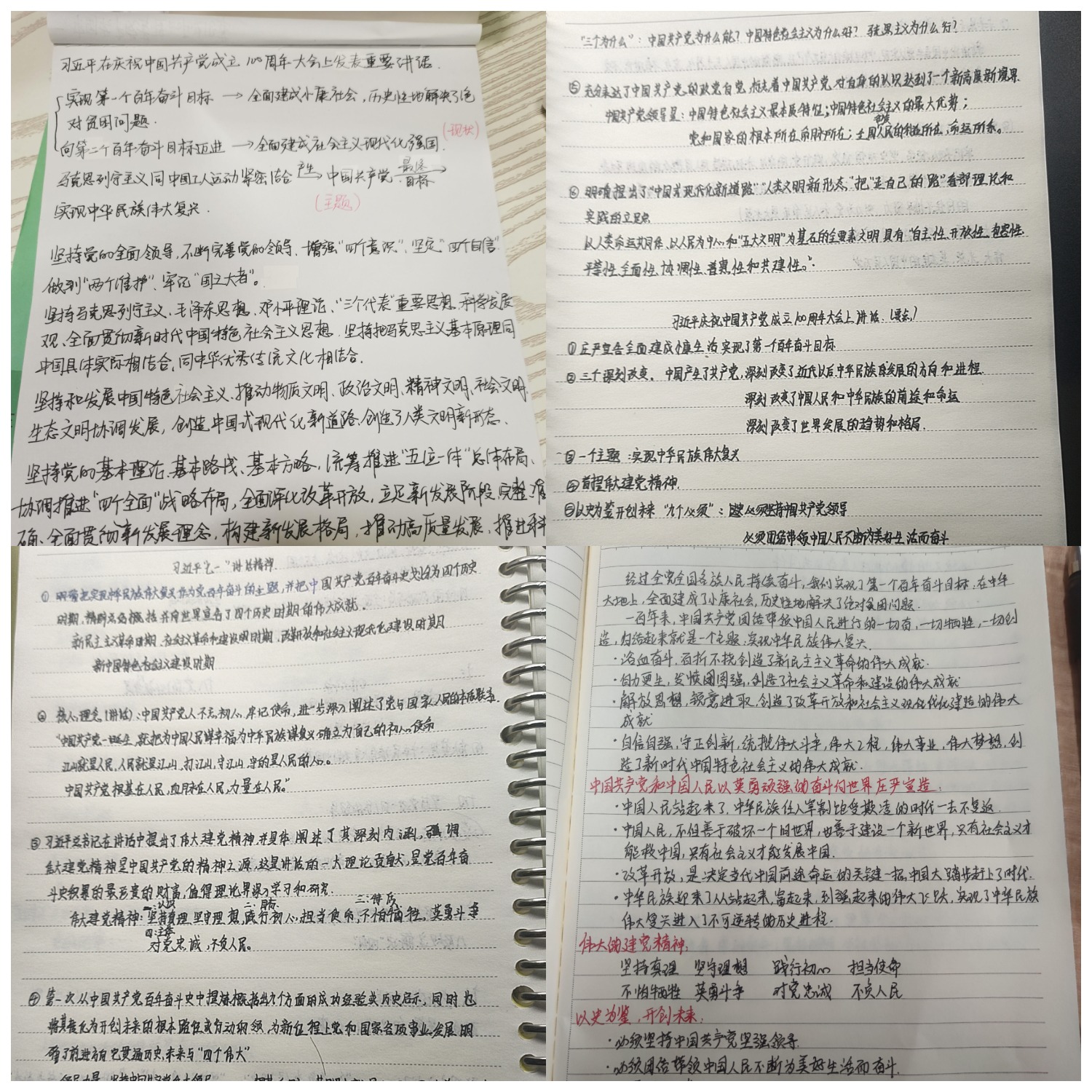 本次的学习任务,依然存在4人未能在规定时间内完成学习,虽然在事后补交了学习笔记,但是无法掌控其是否有真正认真学习观看习近平总书记在庆祝中国共产党成立100周年大会上的讲话全文及视频。虽然都有照片记录,但照片记录反映的只是瞬间的状态,学生学习过程和时长不能掌控。学习笔记能够很好的反映学生学习后的成效,大部分学生学习笔记记录认真、内容丰富、情感真实。但从上传的笔记来看,也有少部分学生纯粹为了完成任务,笔记形式和内容粗糙。