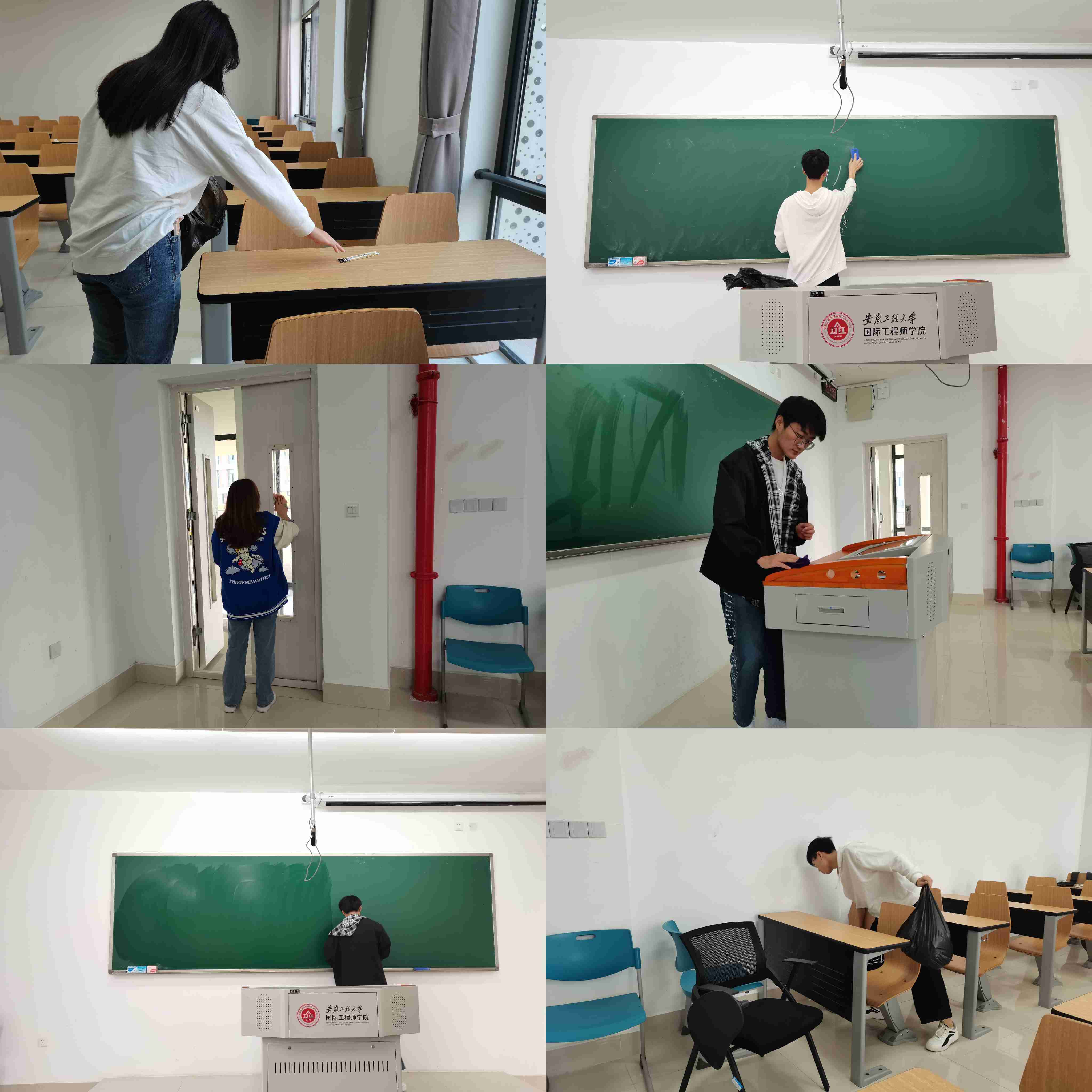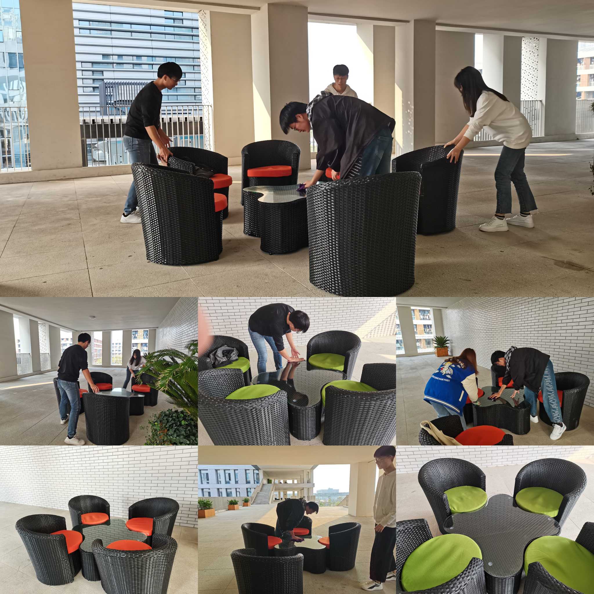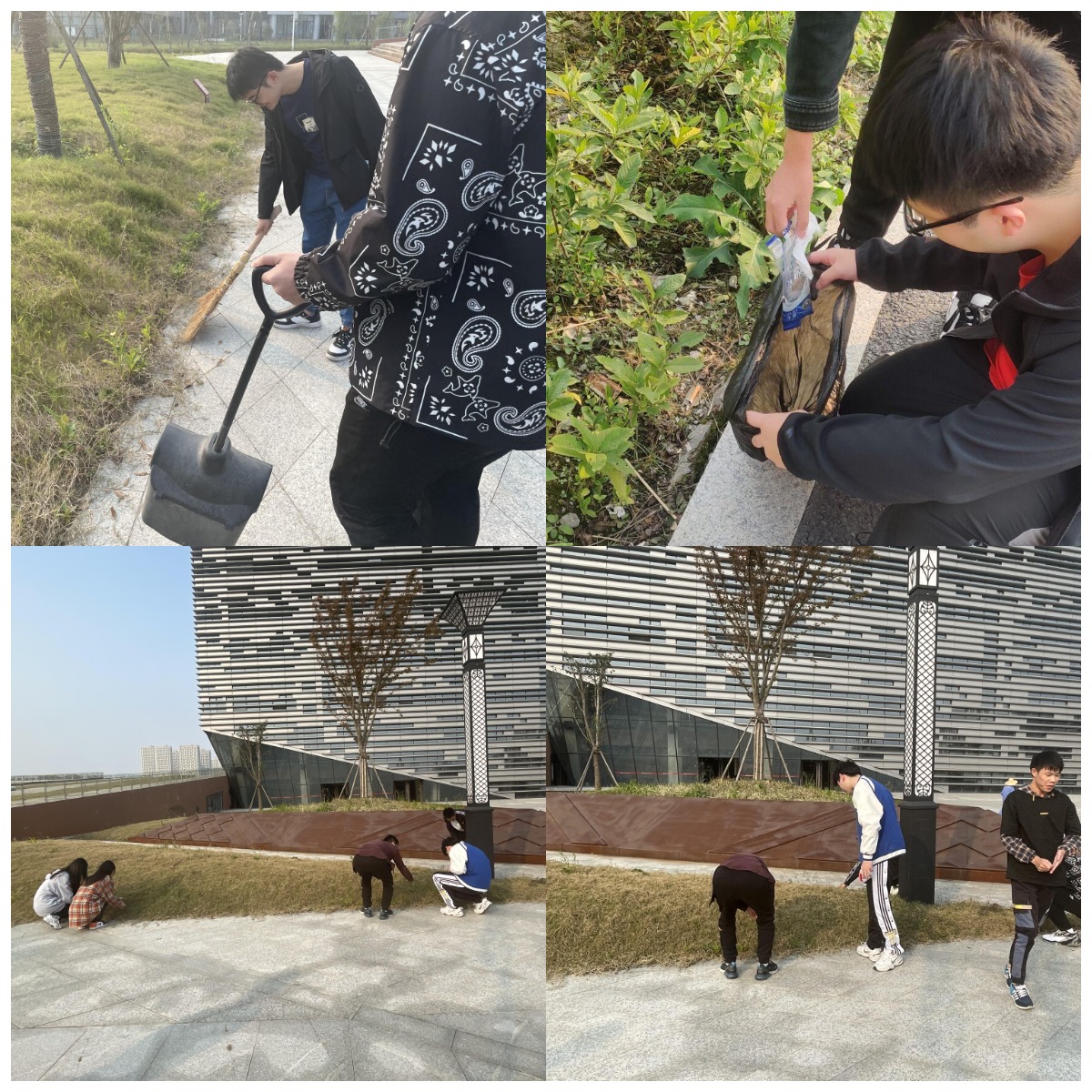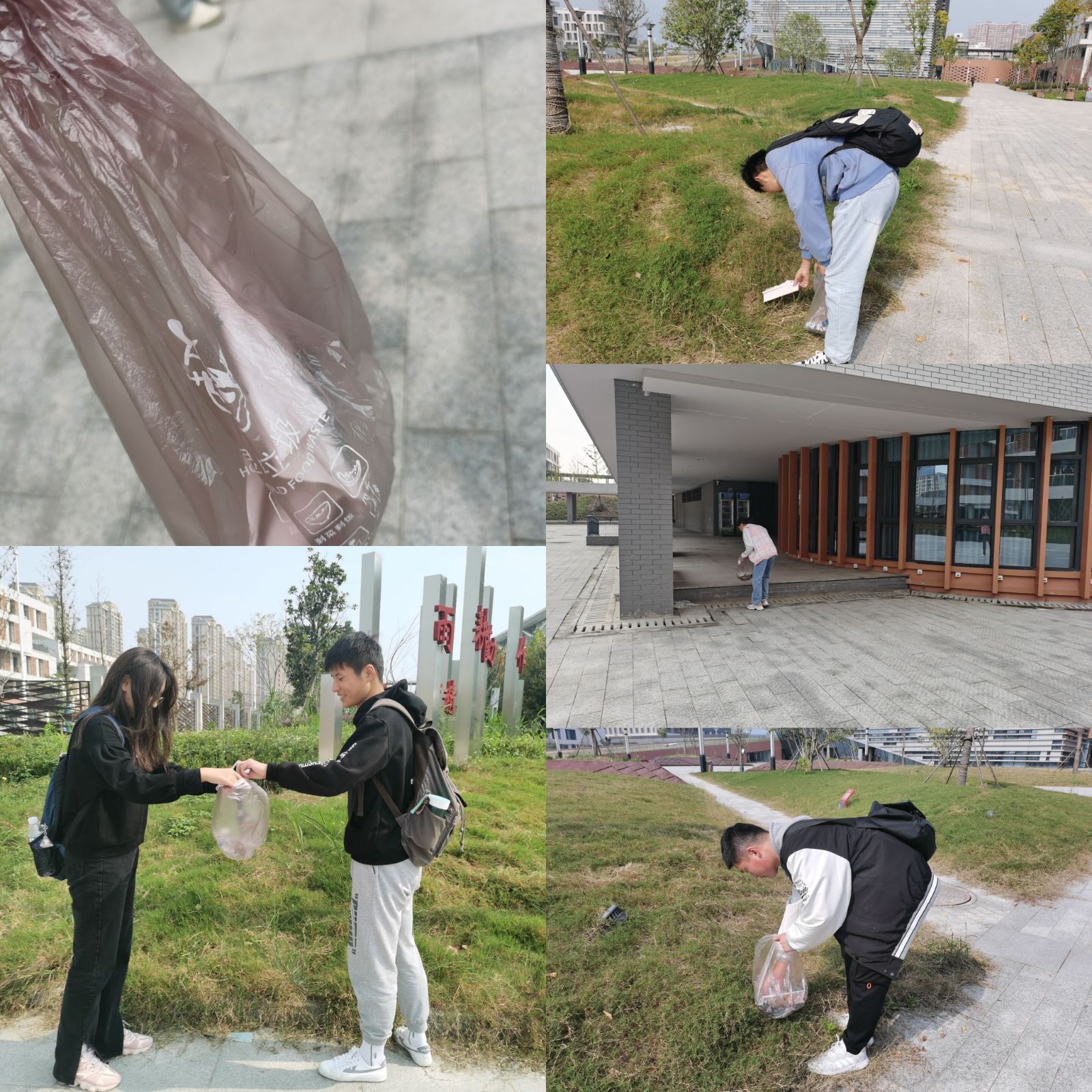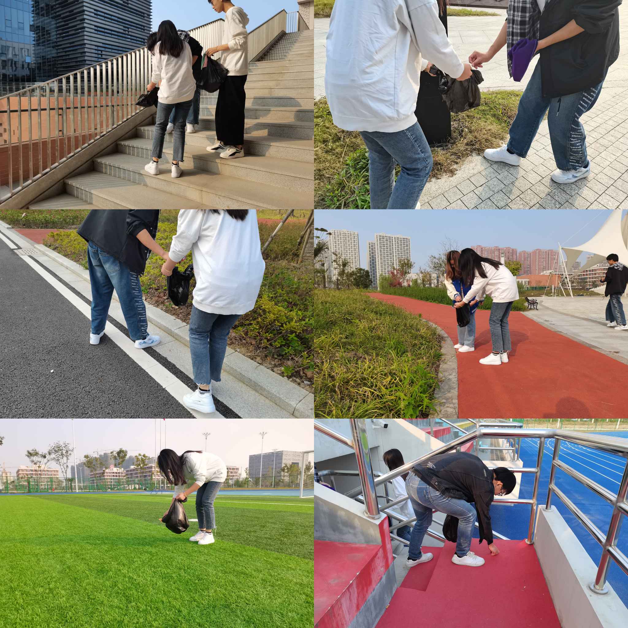 实践内容有5种形式,其中教室卫生打扫与清洁和校园田径场垃圾清理均有3个小组参与,图书馆门口草坪清理、校园宿舍内外垃圾拾捡和学习中心阳台整理与清洁均为2个小组参与。根据各个小组的满意度调查平均分可以看出校园田径场垃圾清理的平均评分最高为9.81,反映了同学们更热衷于在校园田径场参与志愿服务,田径场的开阔露天环境为志愿服务小队提供了更为和谐的氛围。而校园宿舍内外垃圾拾捡则平均评分最低为9.63,主要在于校园宿舍内外活动范围有限,小组成员表示参与度不高。部分志愿服务实践活动照片记录见图3-5。