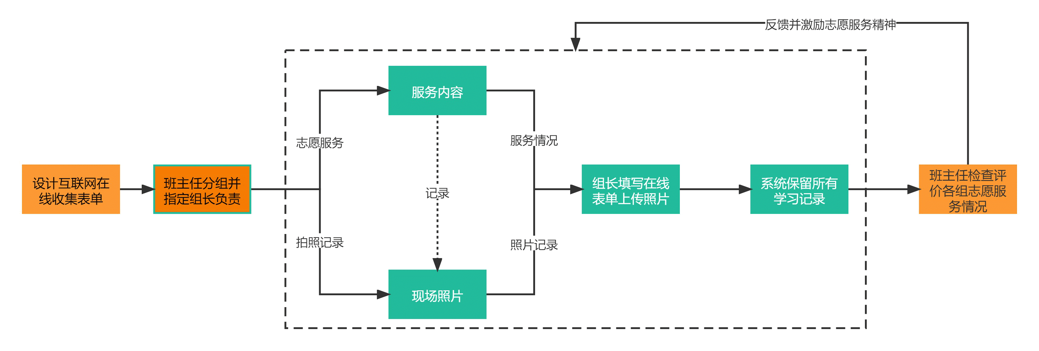 参加校园志愿服务实践活动可以说是本次入党积极分子培训班中具有举足轻重作用的培训内容之一。让入党积极分子参加志愿服务活动可以让其获得课堂以外的知识和收获,起到双向教育的作用。同时对于培养入党积极分子志愿服务精神,发挥先锋模范带头作用具有不可替代的地位,是切实抓好志愿服务型实践育人模式的重要抓手之一。在本次的志愿服务任务当中,仍然需要班主任起到主导作用,需及时有力的提前做好安排,规划好学生的任务完成时限及任务提交方式,班主任也需要及时掌握各小组实践情况。实践育人流程见图3-4,通过构建实践育人流程,能够更好的掌握并不断创新实践育人环节,从而不断完善实践育人工作模式和成效。本次的在线收集表单与图3-2类似,仅仅修改表单文字,在此不再展示。