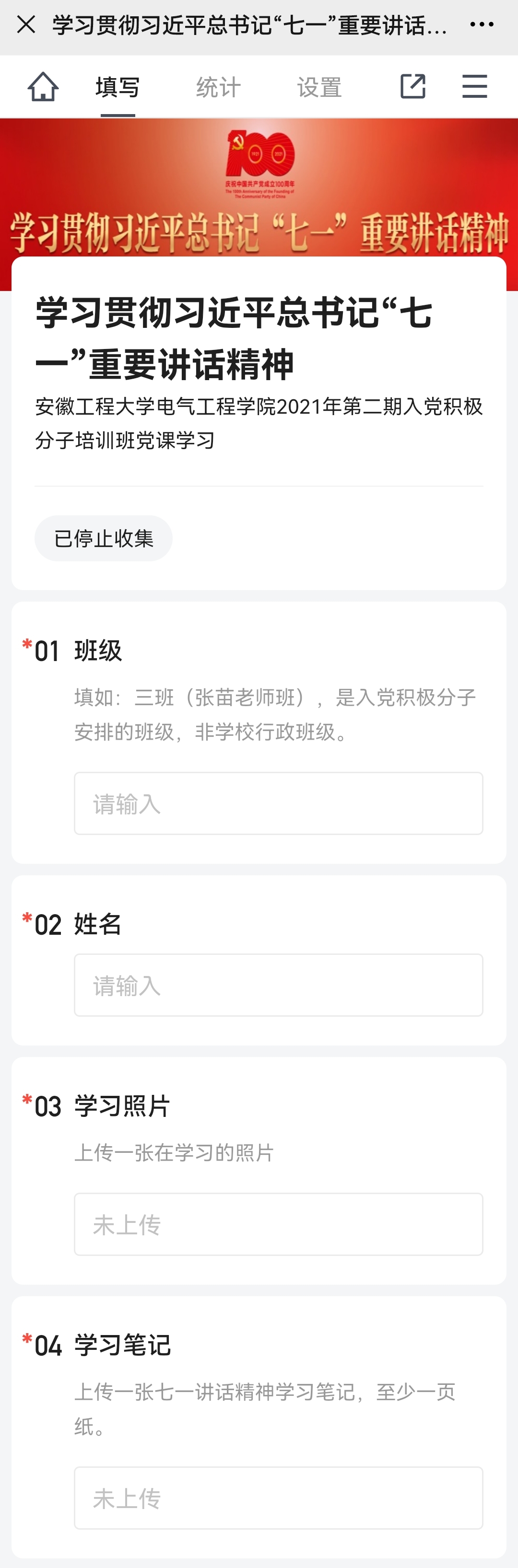其中表单的设计见图3-2,表单形式简单,但内容重点要突出,顶端着重显示建档100周年标志及“学习贯彻习近平总书记“七一”重要讲话精神”字样,展现中国红,弘扬伟大建党精神。而收集的内容,主要在于学生个人信息及学习照片和学习笔记。
