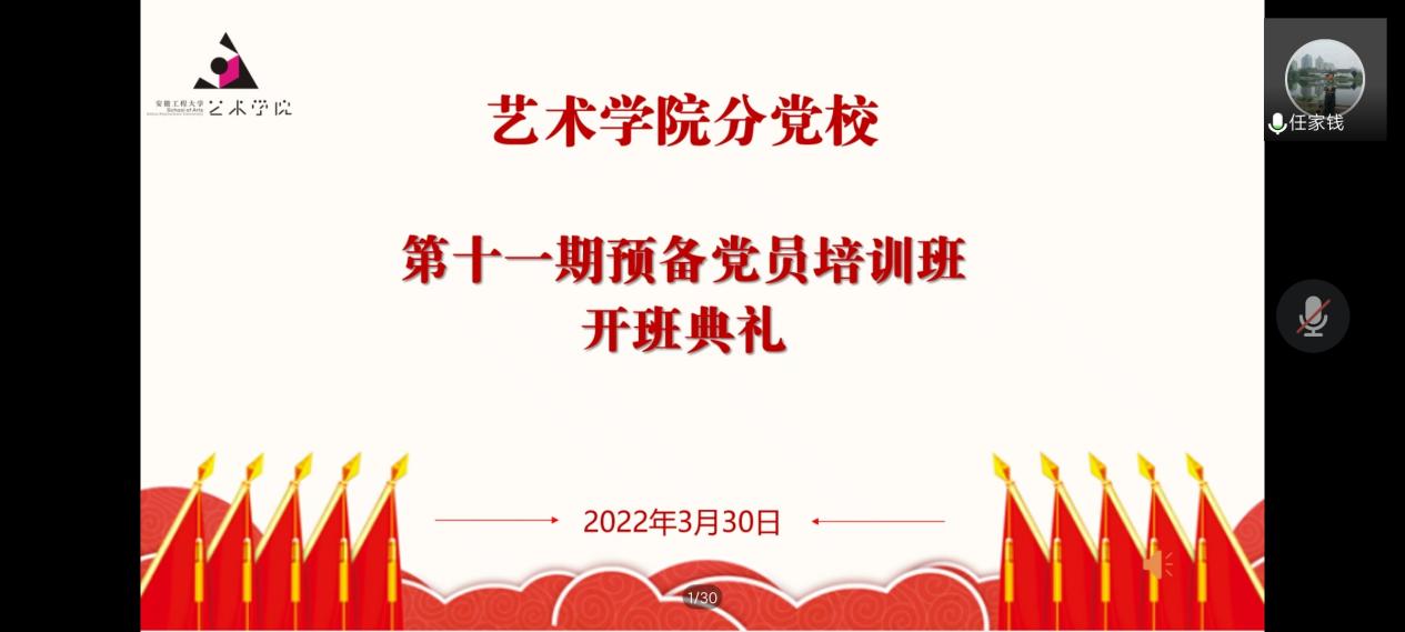 为进一步严格发展党员工作程序,把好党员发展入口关,加强对学院预备党员的教育和培养,330日下午,艺术学院举行了第十一期预备党员培训班开班典礼。结合疫情防控要求,本次培训班开班典礼通过腾讯会议线上举行,院党委副书记任家钱、辅导员田潇濛携第十一期预备党员参加活动。开班典礼由田潇濛主持。