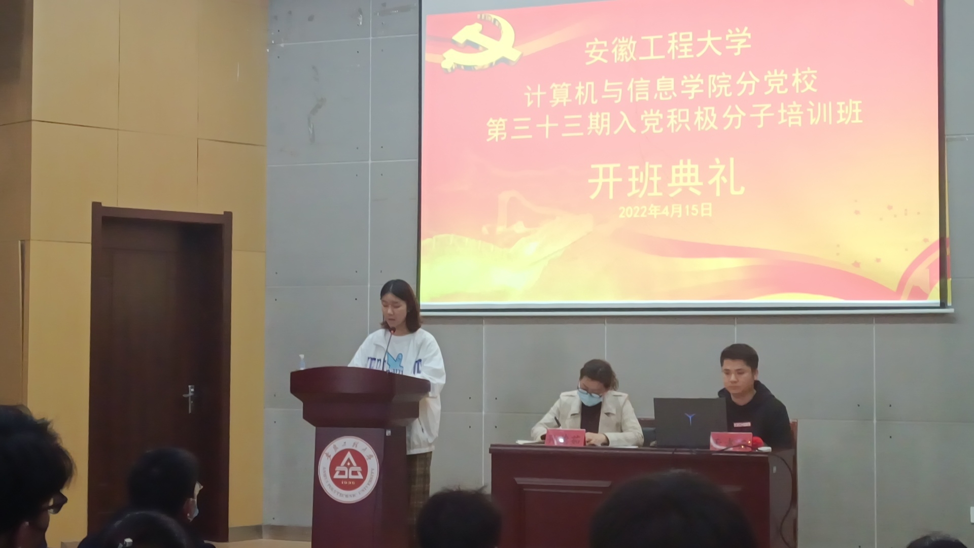 4月15日,计算机与信息学院分党校第三十三期入党积极分子培训班开班典礼在C座报告厅举行。院党委副书记孙德茹、培训班班主任承孝云以及全体学员出席典礼,典礼由承孝云主持。