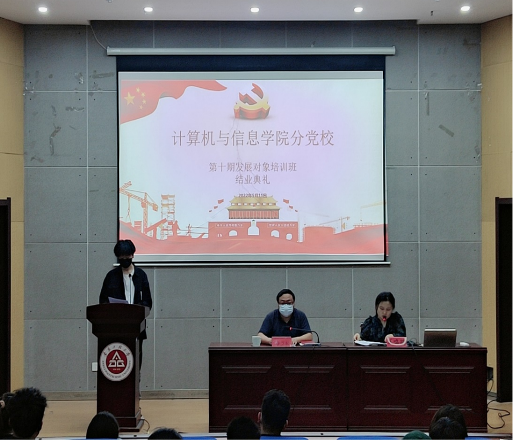 数据科学202班的张子豪作为本期培训班的优秀学员代表进行发言,他分享了自己在培训期间的所学所思所获,并表示青年兴则国家兴,青年强则国家强。全体成员要不断用党的先进思想来武装自己的头脑,将理论与实践相结合,勤奋学习,努力工作。最后他代表本期培训班全体学员承诺在日常的生活和学习中发挥先锋模范作用,在思想和行动上积极向党组织靠拢。