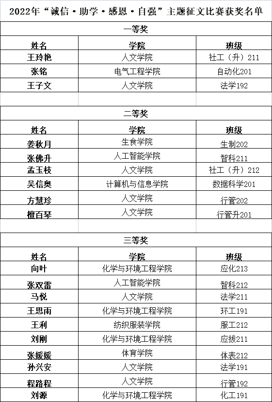 为加强对学生的诚信教育,感恩教育,励志教育,根据《关于开展2022年学生资助诚信教育主题活动的通知》要求,经过学生提交作品,学生处组织评委评审,确定王玲艳等19名同学获得2022年“诚信·助学·感恩·自强”主题征文比赛奖项(见附表),现予以公布。