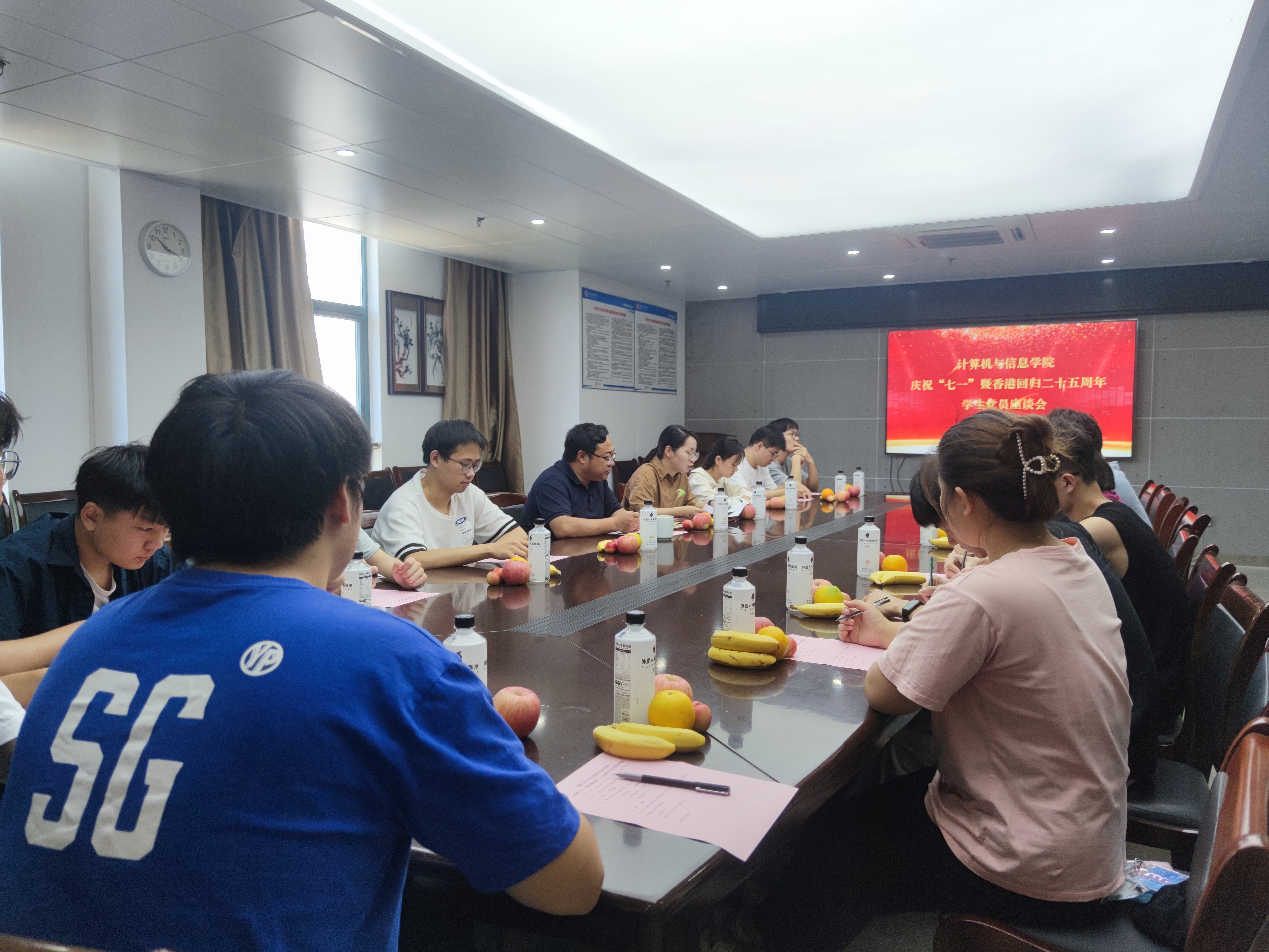 为庆祝中国共产党建党101周年暨香港回归祖国25周年,进一步了解暑期留校学生思想、生活动态,关心关爱学生,7月1日上午,计算机与信息学院召开主题座谈会。院党委书记李卫东、院团委副书记兼学工秘书吕寅、留校学生党员代表参加座谈会。