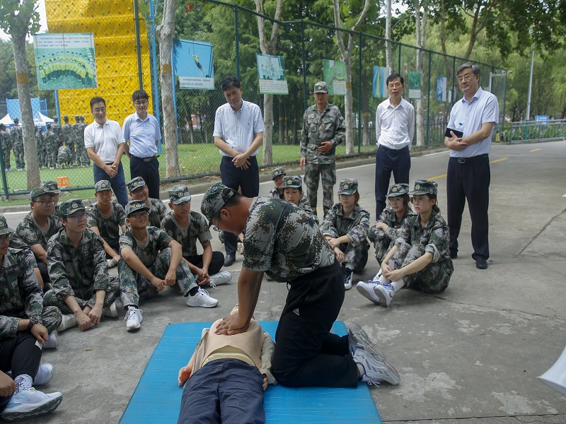 校领导听取了学生处关于军训开展情况的介绍,详细了解了各学院开展新生军训工作情况,与参训学生进行了亲切交流,并慰问了因身体不适办理免训的学生。张志宏向同学们讲解军训的意义,鼓励同学们通过训练磨练意志,增强体质,希望教官严格要求,认真带训,将军训中养成的的好传统、好思想、好作风继续保持下去,把军训成果固化到今后的学习、生活和社会实践中,做一个有理想有目标,有担当有作为的新时代大学生。王绍武对承担军训任务的教官、参与指导保障服务的工作人员的辛勤付出表示赞赏,对参训学生不畏艰苦的训练热情和斗志昂扬的精神风貌给予高度赞扬。他叮嘱新生辅导员、带训教官要科学带训,实时关注新生军训、生活和健康状况,特别是做好对免训学生的关心关爱,勉励他们利用好这段时间提前感受专业知识,多读书,勤学习。郑健勉励同学们继承发扬不怕苦、不怕累、连续作战的作风,克服困难、经受磨练,高质量完成训练任务,要求相关负责部门在接下来的军训工作中,再接再厉,科学施训,密切关注参训师生的身心健康,做好服务保障,确保顺利完成军训任务。