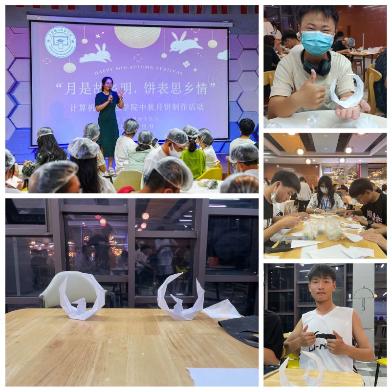 月饼制作完成后,同学们纷纷提笔在许愿纸上写下自己的心愿,把许愿纸折成皓月和玉兔的形状,大家互相展示手中的折纸作品,将对大学生活的希冀和期盼寄托在其中,每个人的脸上都洋溢着微笑,折纸活动充分激发了大家的动手能力,营造了浓浓文化气息的中秋佳节氛围。