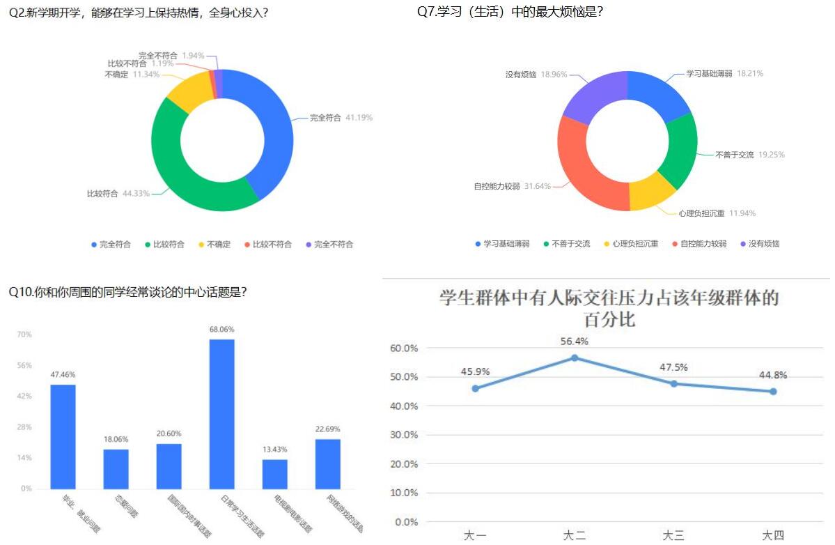 坚持调研为先,了解事实“数据谈”。电气工程学院依据调研内容,精心制作了调研问卷,并于9月5日向全院学生发布,一周内共收集有效问卷670份,各年级学生均有参与。学院组织辅导员老师对数据就行了深入分析,让数据赋能学生工作,借助数据准确把握年级学生的差异化特点,分层分类进行教育引导,扎实推进学生工作由“管理”向“服务”转变。调查结果显示:自控力薄弱、不善交流、学习基础薄弱和心理压力是学生在学习生活中的主要烦恼;约50%的学生对国内、国际热点问题有较高的关注度,90%以上的学生对二十大的召开表示期待。