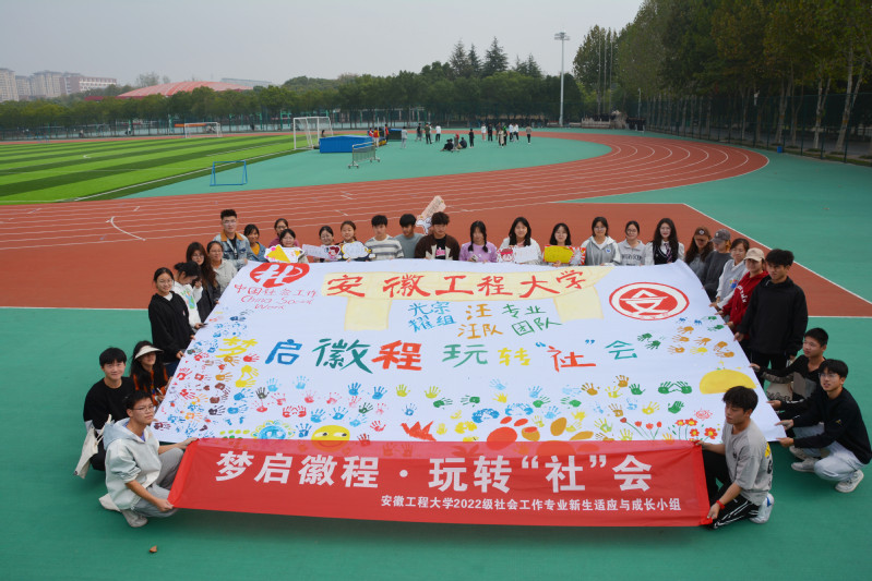启动会后,第一次小组活动“你我初相识”在校第一田径场开展。组员与社工通过拼图配对,分成三个平行小组,各组自行设计小组队名、口号并进行展示,随后各小组进行分工,分别从小组主题、人文学院院徽、社会工作标识等内容出发,共同完成“青春蓝图”的绘制。活动尾声,各组组员代表就本次小组活动感受进行分享交流。