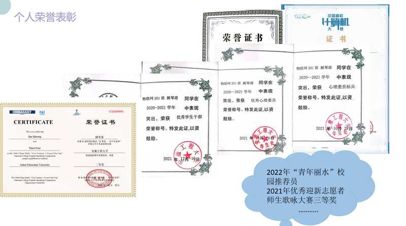 三年来,阙琴溶勤学苦读,学业成绩优异,获评“三好学生”、“优秀学生干部”、“优秀团员”、2022“青聚浙丽”社会实践优秀实习生、奖学金等荣誉十余次,积极参加学科竞赛,获得国家网络技术挑战赛二等奖、安徽省计算机设计大赛优胜奖等荣誉奖项。课外,阙琴溶同学还积极参与学生工作、干部竞选、志愿服务、社会实践活动来不断地提高自己的实践能力,全面发展自我。