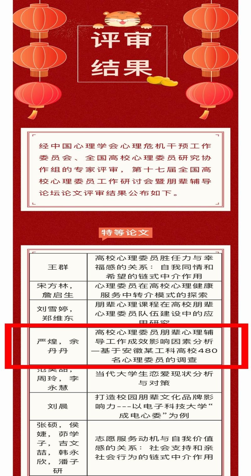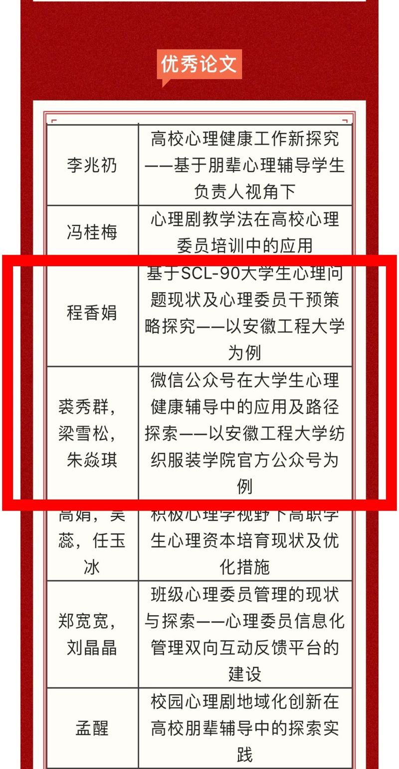 经会议评审,我校人文学院严煌,余丹丹撰写的论文《高校心理委员朋辈心理辅导工作成效影响因素分析—基于安徽某工科高校480名心理委员的调查》获得特等论文奖,心理健康教育中心程香娟撰写的论文《基于SCL-90大学生心理问题现状及心理委员干预策略探究—以RayBetApp官网下载 为例》及纺织服装学院裘秀群,梁雪松,朱焱琪撰写的论文《微信公众号在大学生心理健康辅导中的应用及路径探索—以RayBetApp官网下载 纺织服装学院官方公众号为例》获得优秀论文奖。