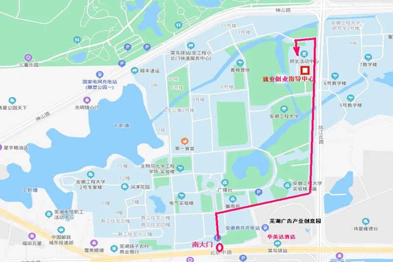 2.校本部所有进校企业代表均须从学校南大门进入,学校位置及具体行进路线如下。