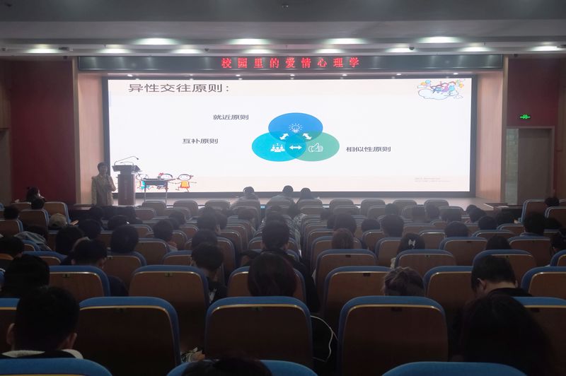 葛毅主任以“校园里的爱情”为主题,从“世界很大,找到真爱的概率有多大”、“王子和公主的恋爱故事”、“恋爱中的三心二意”三个模块全方位讲解了选择爱情、经营爱情和恋情中可能出现的问题。葛主任首先从彼得·巴斯克的“德雷斯”公式,分析遇到“真爱”的概率,以此引出异性交往的原则,再通过三个理论分析如何更好地找到适合自己的另一半。葛主任又利用了王子和公主的例子,形象生动地介绍了恋爱后和恋爱前期的区别,解释了感情的长久与稳定应该依靠什么,以及如何经营好一段感情。最后,针对恋爱中的问题,葛主任也进行了详细的介绍,从情感问题分类和心理原因两方面阐述了实际恋爱中可能存在的问题。听了讲座,同学们更加清晰地认识到爱情的美好需要恋爱双方相互支持共同经营。
