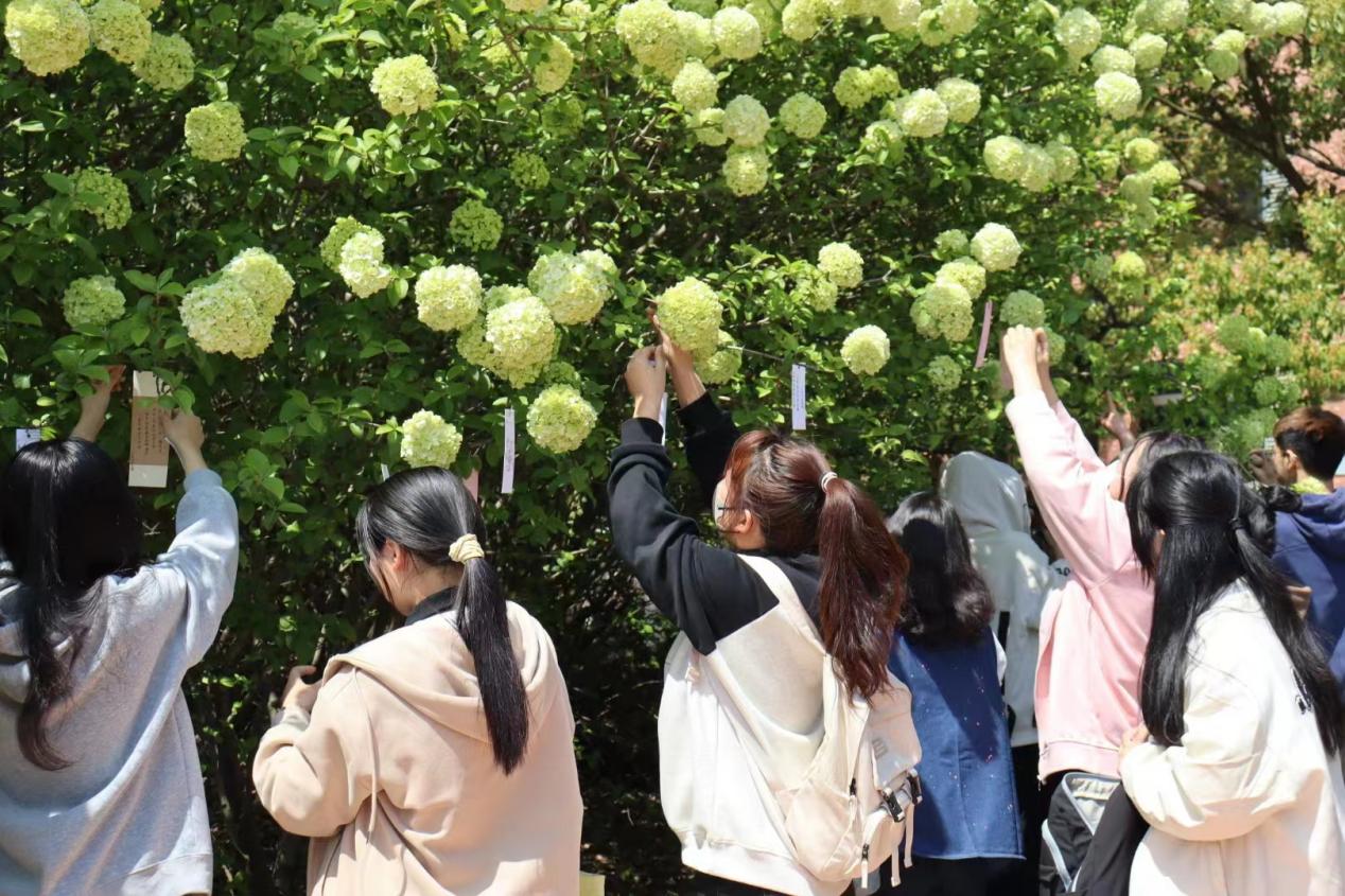 3月28日春花争艳,绣球沉甸甸满枝头,设计学院学生广告221班的同学在苏杨老师的指导下,在《创意写作》课间,开展了“写给春天的诗”课程实践活动。在春意盎然的阳光里,他们在7教楼前的绣球花下用书写书签的形式写下对春天的敬意。