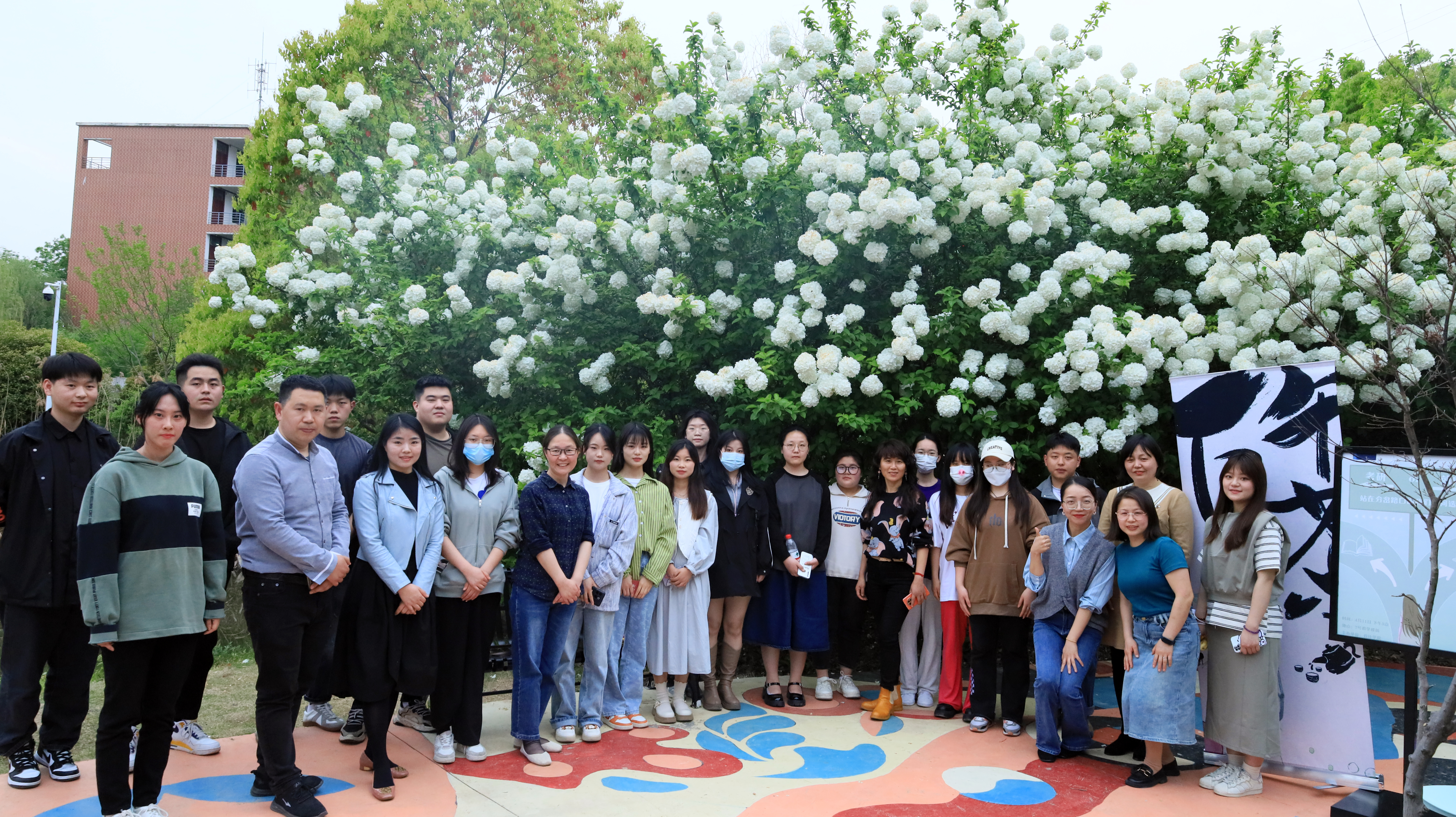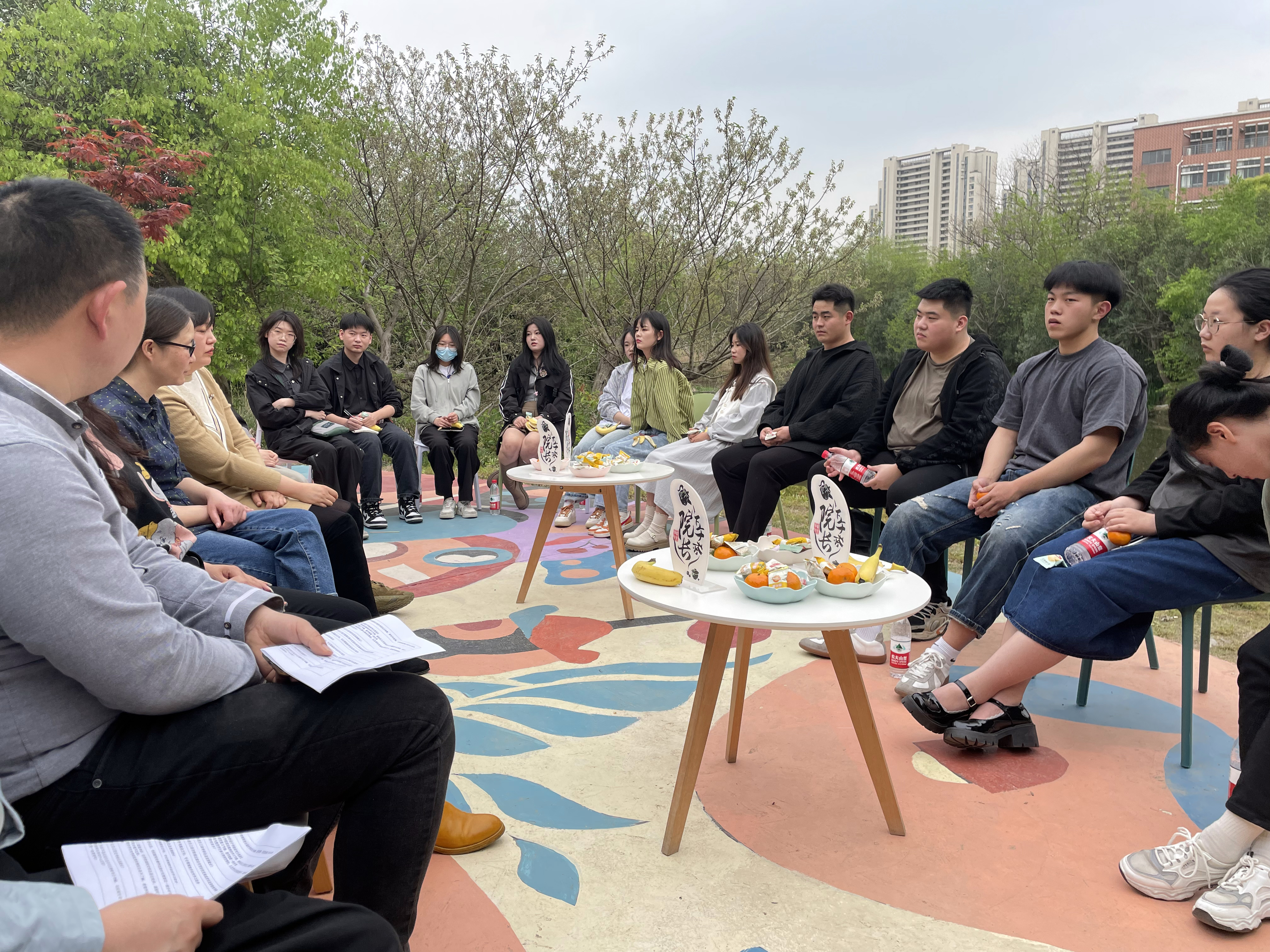 高枝带雨压雕栏,一蒂千花白玉团。在这个春风和煦、花香醉人的午后,设计学院楼前的湖边彩绘打卡地传来热切的讨论声。寻声看去,原来是设计学院在举办院长下午茶。本次下午茶活动由设计学院副院长王小元发起邀请,党委副书记彭海燕,专业教师李响、张翠老师,组织员张焱老师,辅导员姚丽、李荣杰老师,19级就业和考研的毕业生代表张东、张倩茹,以及17位20级学生代表一起围坐畅聊“考研or就业,站在分岔路口的我们如何选择?”的话题。