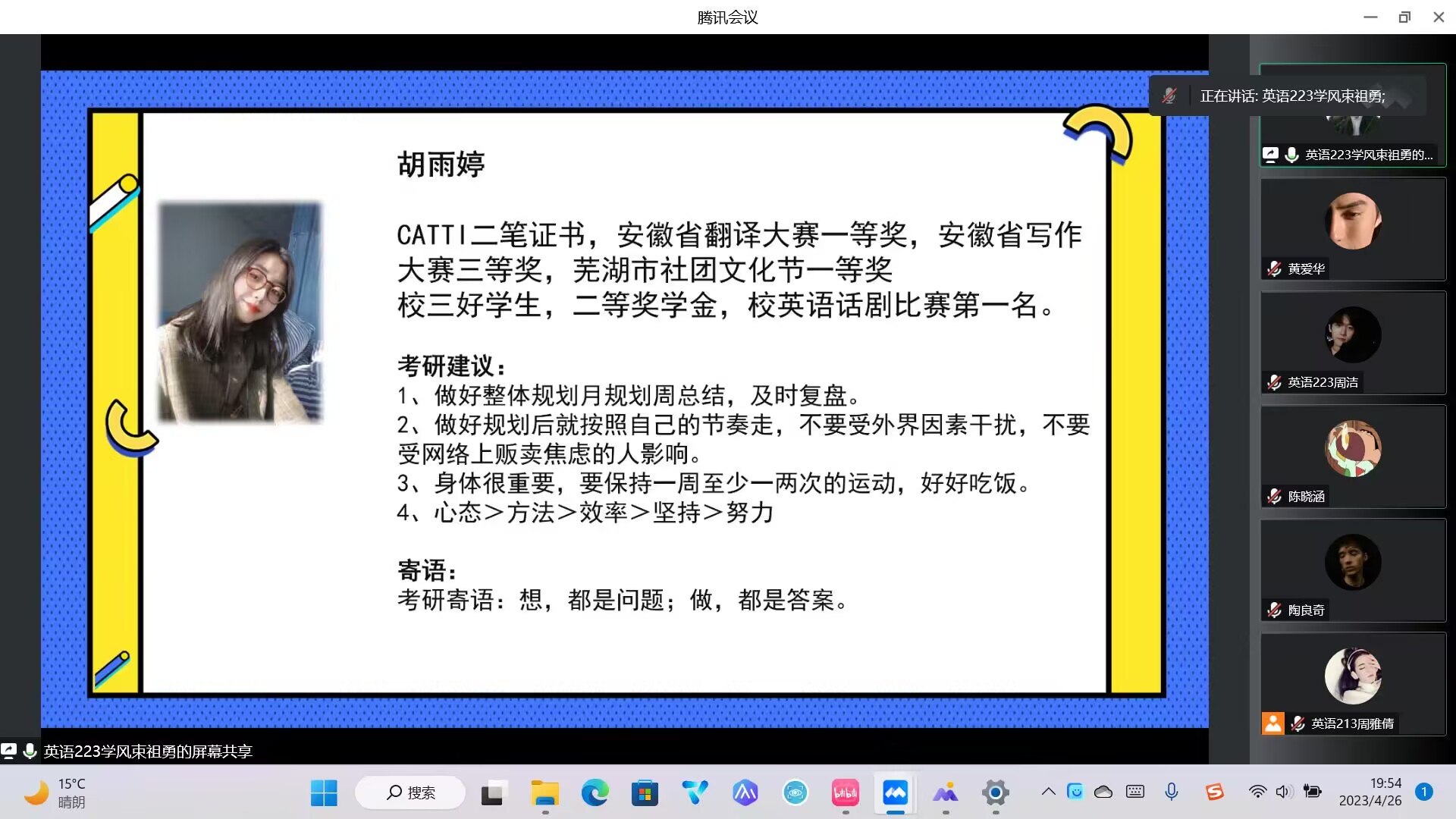 为深入落实学校“三抓”和“三全六专”工作要求,进一步加强学院学风建设,外国语学院通过线上线下相结合的方式,在4月19日和4月26日分别举办了两场主题为“学奋斗精神,绘青春‘研’色”的考研经验交流会。被南京大学、外交学院、吉林大学等知名院校录取的9名考研上岸同学应邀分享成功经验和备考技巧,120余名大二和大三同学参加交流会。