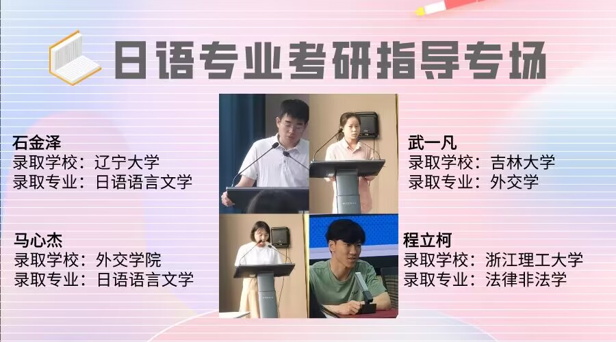 合理规划,有条不紊。被安徽大学录取的陶良奇和被辽宁大学录取的石金泽结合自身考研经历,重点从备考计划和复习方法两个方面做了分享。谈到备考计划时,他们都认为,要处理好“一大一小”的关系,即整体大计划和每天的小计划之间的关系。他们强调,要结合自身的知识结构合理做好复习时间整体分配,同时充分利用好课余时间做好每天的复习计划。他们从如何提高英语和日语听、说、读、写能力,如何备考英语翻译和日语语言文学等方面分享了备考方法。