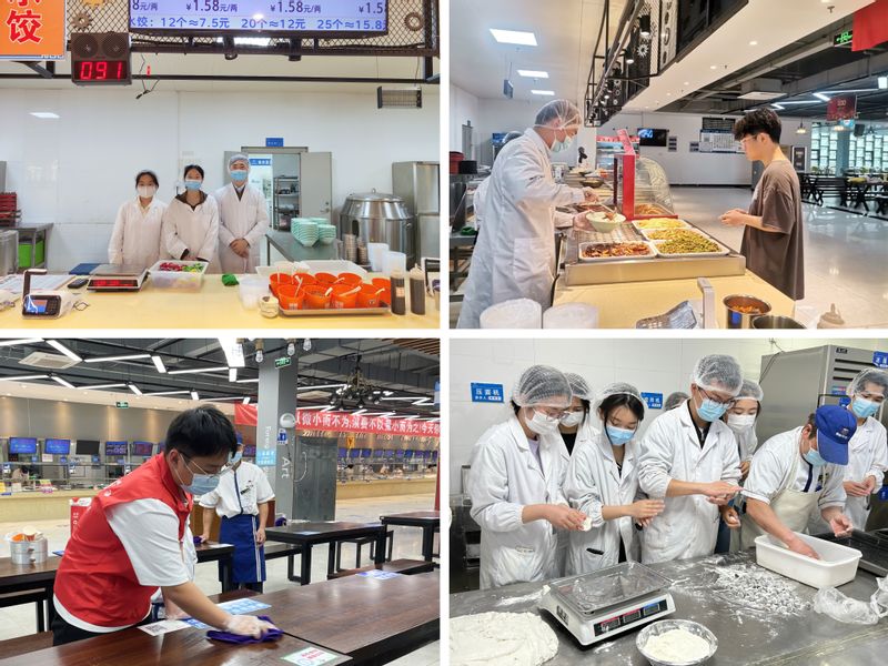 活动中,大家积极到岗,佩戴好口罩,穿戴好衣服,在食堂工作人员的指导下,分组行动、相互配合。打扫卫生、学做麻团、擦洗桌子、窗口售卖、盛饭打汤等,同学们井然有序地忙活起来,大家在劳动中交流心得、沟通思想,安静的食堂瞬间热闹起来。经过三个小时的辛勤劳动,大家在欣赏自己劳动成果的同时也体悟到各行各业的艰辛不易,正是食堂工作人员的踏实付出和不畏辛劳,为全校师生提供了安全可靠的餐饮保障。