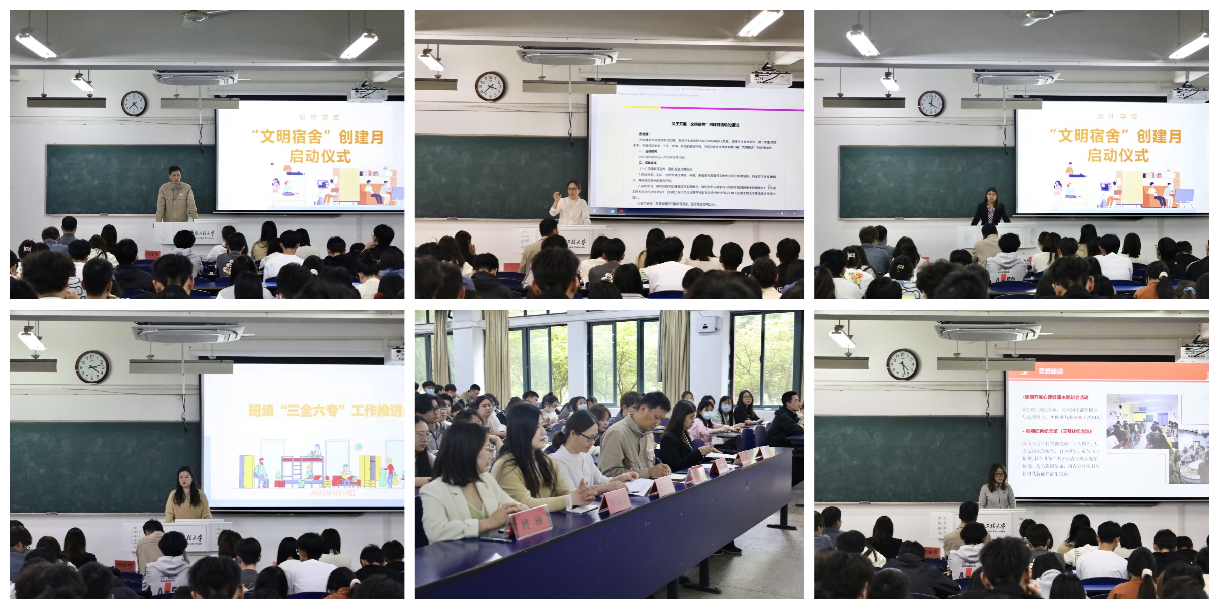 为进一步落实“三抓”工作要求,推动学校“三全六专”育人工作在班级的实践,加强学生宿舍教育与管理,发挥学生宿舍服务育人和环境育人功能,积极营造安全、卫生、文明、和谐的宿舍环境,5月10日,设计学院于6J111举办“文明宿舍”创建月启动仪式暨班级“三全六专”工作推进会议,院党委书记胡家增、副书记彭海燕、全体辅导员,以及各班级班长、生活委员、男女生寝室长代表参加活动。