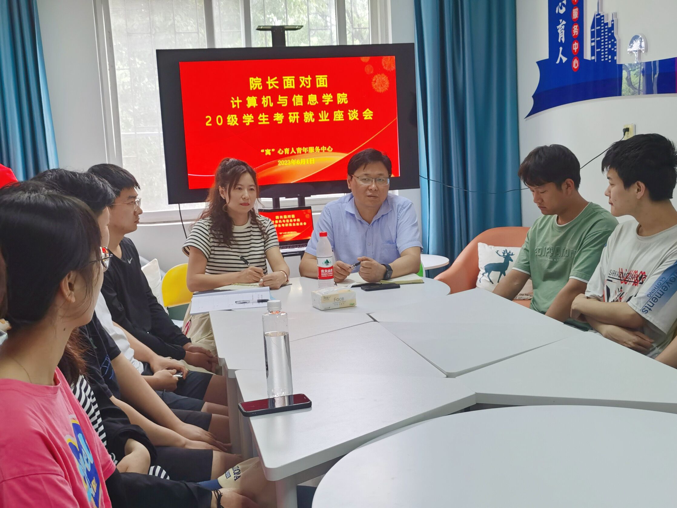 为深入落实“三全六专”育人实践工作要求,结合学习贯彻习近平新时代中国特色社会主义思想主题教育,进一步了解学生思想动态,倾听学生心声,回应学生关切,助力学生成长。6月1日下午,计算机与信息学院召开“院长面对面”20级学生考研就业座谈会。院长汪军、辅导员魏晓飞以及18名来自不同专业的20级本科生面对面谈体会,心连心论发展。