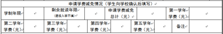 3、申请学费减免情况需要学生向学校财务处确认后填写。“剩余就读年限”指“学制年限减去入伍前已读年限”;“申请学费减免总计”填写剩余年限学费总和,后面每学年学费从第一学年开始填写。如学制4年,大一读完应征入伍,剩余年限读3年,分别填写第一学年、第二学年、第三学年。