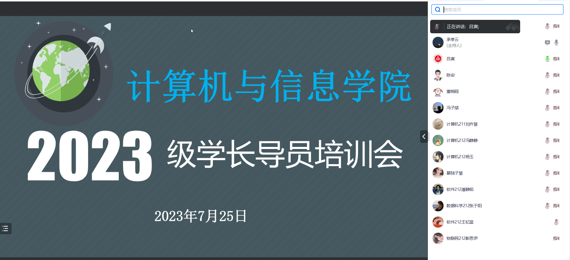 为帮助新生提前适应大学生活,发挥学长导员朋辈榜样影响力,提高学长导员的新生服务管理能力,7月25日,计算机与信息学院召开2023级新生学长导员线上培训交流会。院团委副书记吕寅、辅导员瞿陆子慧、陈安、承孝云,2023级新生学长导员参加。会议由承孝云主持。